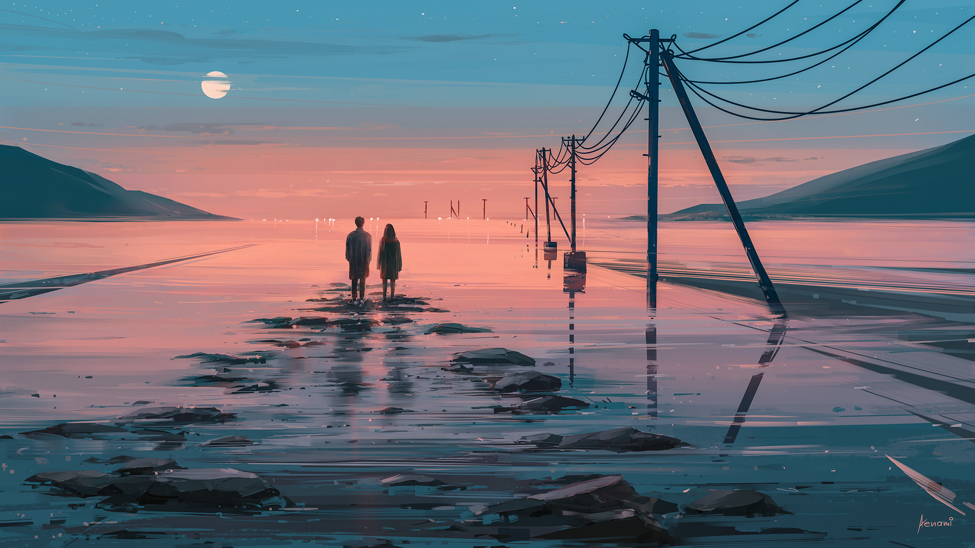 1boy 1girl aenamiart artist_name blue_sky commentary english_commentary from_behind full_moon gradient_sky highres moon orange_sky original outdoors painterly power_lines rock scenery side-by-side sky standing star_(sky) starry_sky utility_pole water
