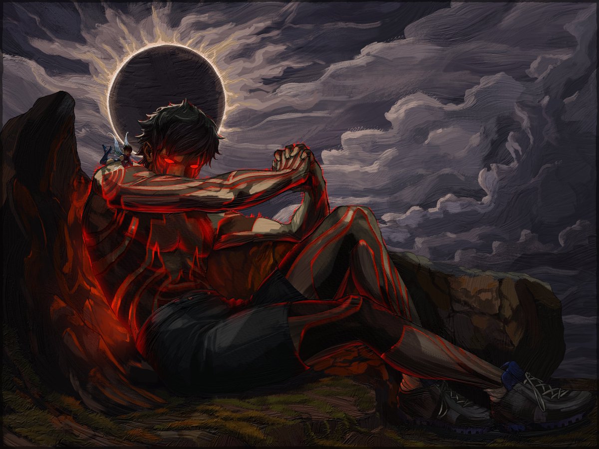 1boy 1girl ant_jams black_hair black_shorts blue_gloves blue_leotard blue_thighhighs cloud dark_cloud demi-fiend demon_(megami_tensei) eclipse fairy fairy_wings fine_art_parody full-body_tattoo gloves glowing glowing_eyes glowing_tattoo knee_up leotard looking_at_viewer male_focus mini_person mini_person_on_shoulder minigirl outdoors overcast own_hands_together parody pixie_(megami_tensei) red_eyes red_tattoo shin_megami_tensei shin_megami_tensei_iii:_nocturne shoes short_hair shorts sitting sky sneakers solar_eclipse solo_focus tattoo the_fallen_angel_(painting) thighhighs topless_male wings