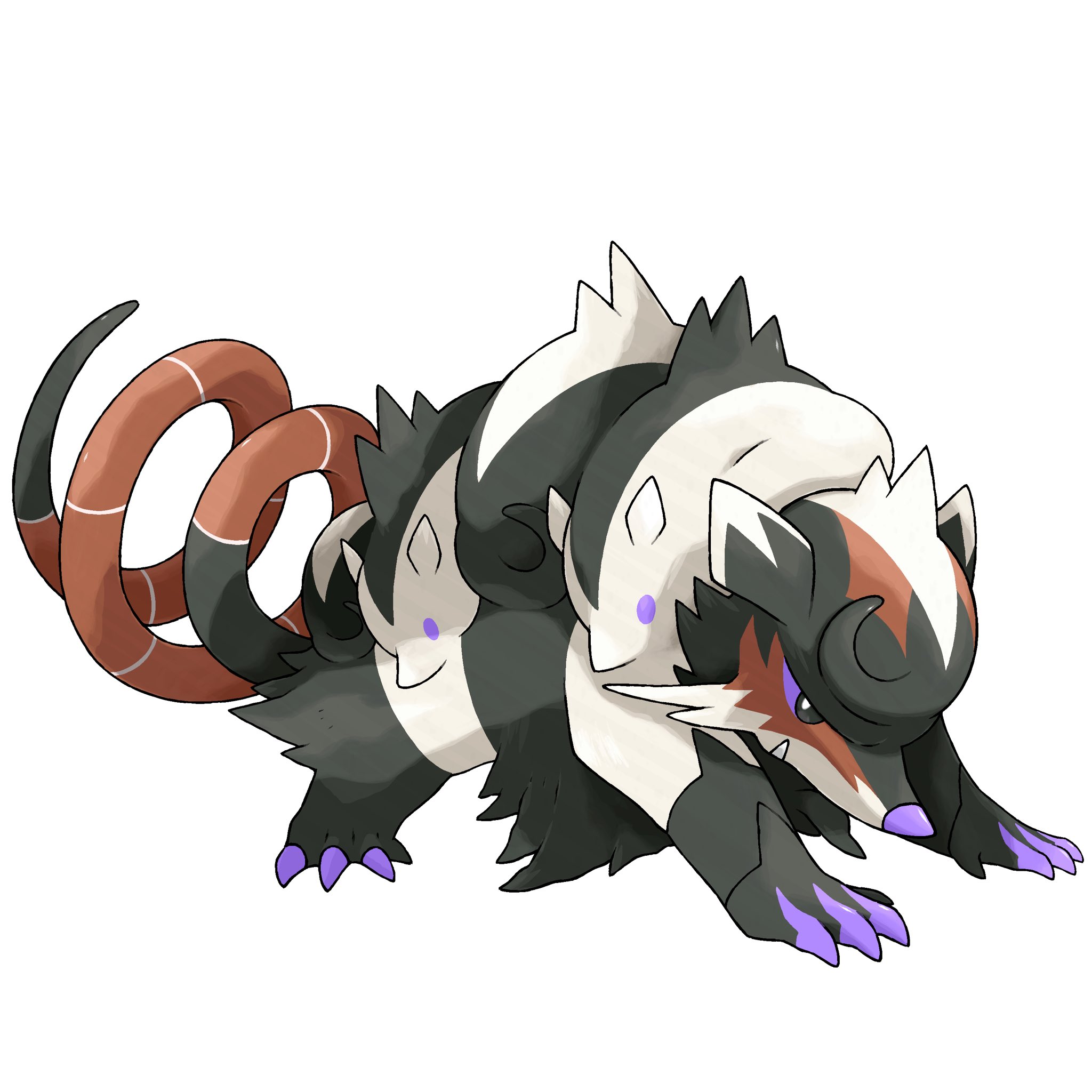 black_fur claws curled_tail fakemon greg_andrade highres nintendo no_humans original pokemon pokemon_(creature) possum purple_eyes simple_background solo sugimori_ken_(style) two-tone_fur white_background white_fur