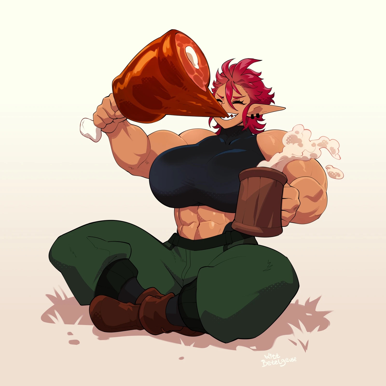 abs ali_(sotcho) artist_name baggy_pants beer_mug black_gloves black_shirt blush boots borrowed_character breasts brown_boots clenched_hand closed_eyes collarbone commentary crop_top cup dark-skinned_female dark_skin earrings eating english_commentary female_focus gloves grass green_pants happy highres indian_style jewelry kitt_betelgeuse large_breasts long_hair midriff mug muscular muscular_female navel open_mouth original pants pointy_ears red_hair shadow sharp_teeth shirt simple_background sitting smile solo sweatpants taut_clothes teeth very_long_hair