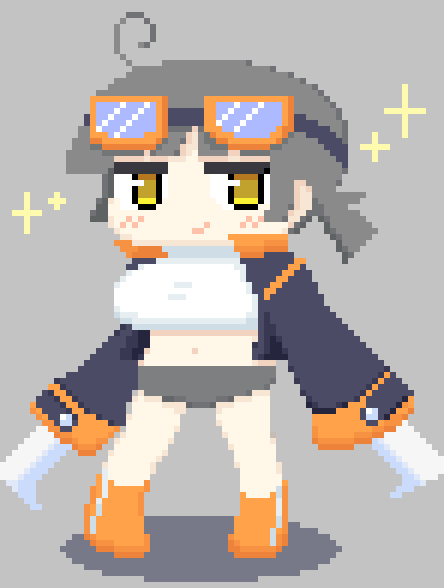 1girl ahoge blush boots breasts cello_(20000) character_request crop_top female_focus goggles goggles_on_head grey_background grey_hair jacket looking_at_viewer open_clothes open_jacket orange_boots pixel_art shirt short_shorts shorts smile solo standing stomach white_shirt yellow_eyes