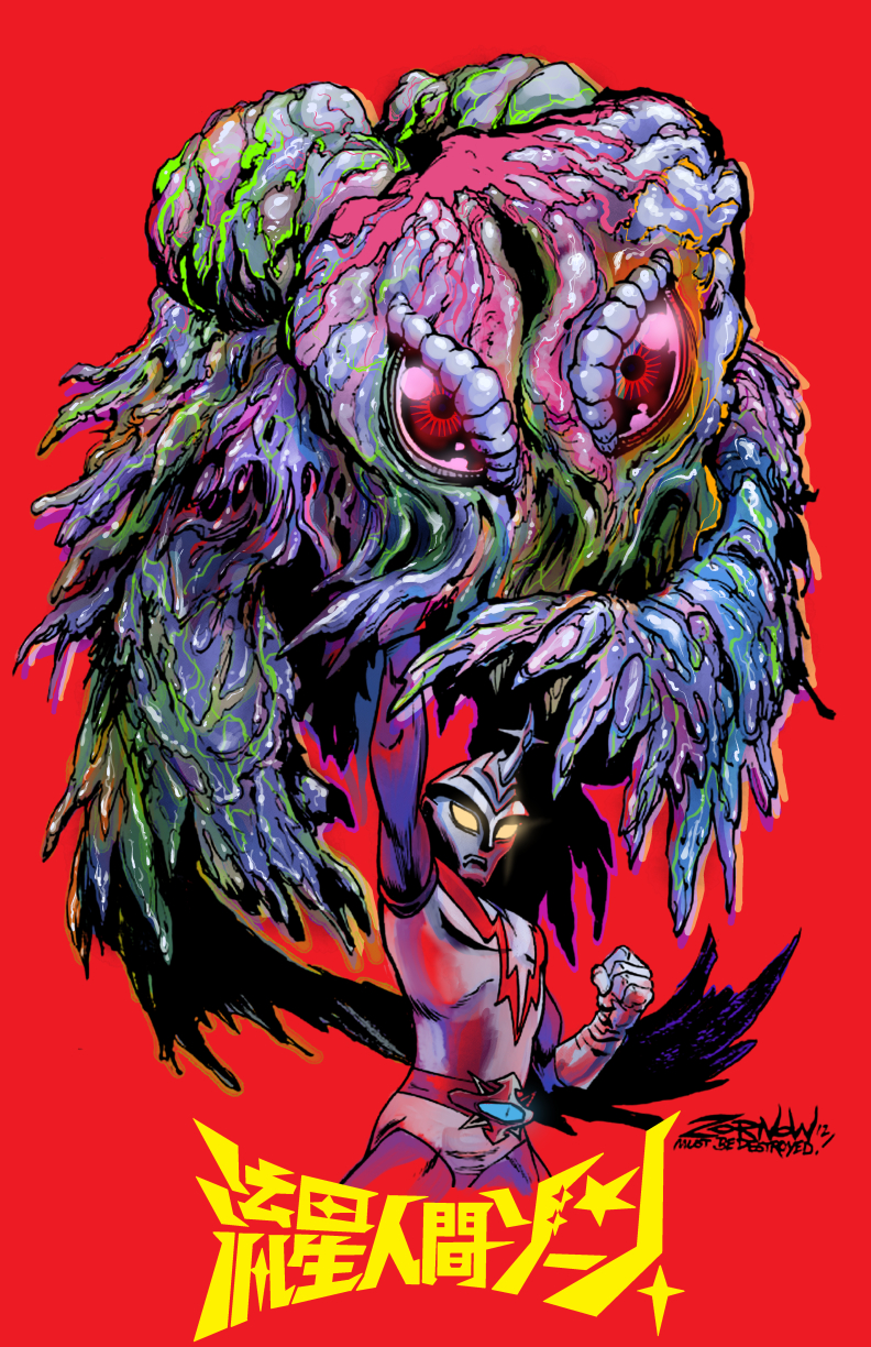 1boy alien artist_name belt_buckle buckle company_connection copyright_name crossover english_text fighting giant giant_monster glowing godzilla_(series) godzilla_vs._hedorah hedorah horns japanese_text jeff_zornow kaijin kaiju looking_at_viewer monster no_pupils punching red_background red_eyes seijin signature simple_background single_horn slime_(creature) slime_(substance) space_monster superhero_costume tail toho uppercut veins vertical_eyes yellow_eyes zone_fighter zone_fighter_(series)