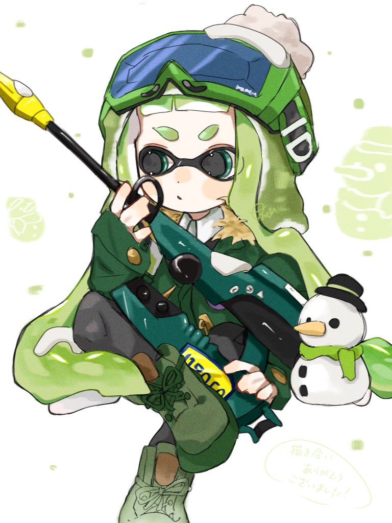 1girl beanie commentary_request goggles goggles_on_head green_eyes green_hair green_hat green_shoes hat himama_rt inkling inkling_girl inkling_player_character jet_squelcher_(splatoon) long_hair long_pointy_ears looking_to_the_side nintendo pointy_ears shoes sitting ski_goggles snowman solo splatoon_(series) splatoon_3 very_long_hair white_background