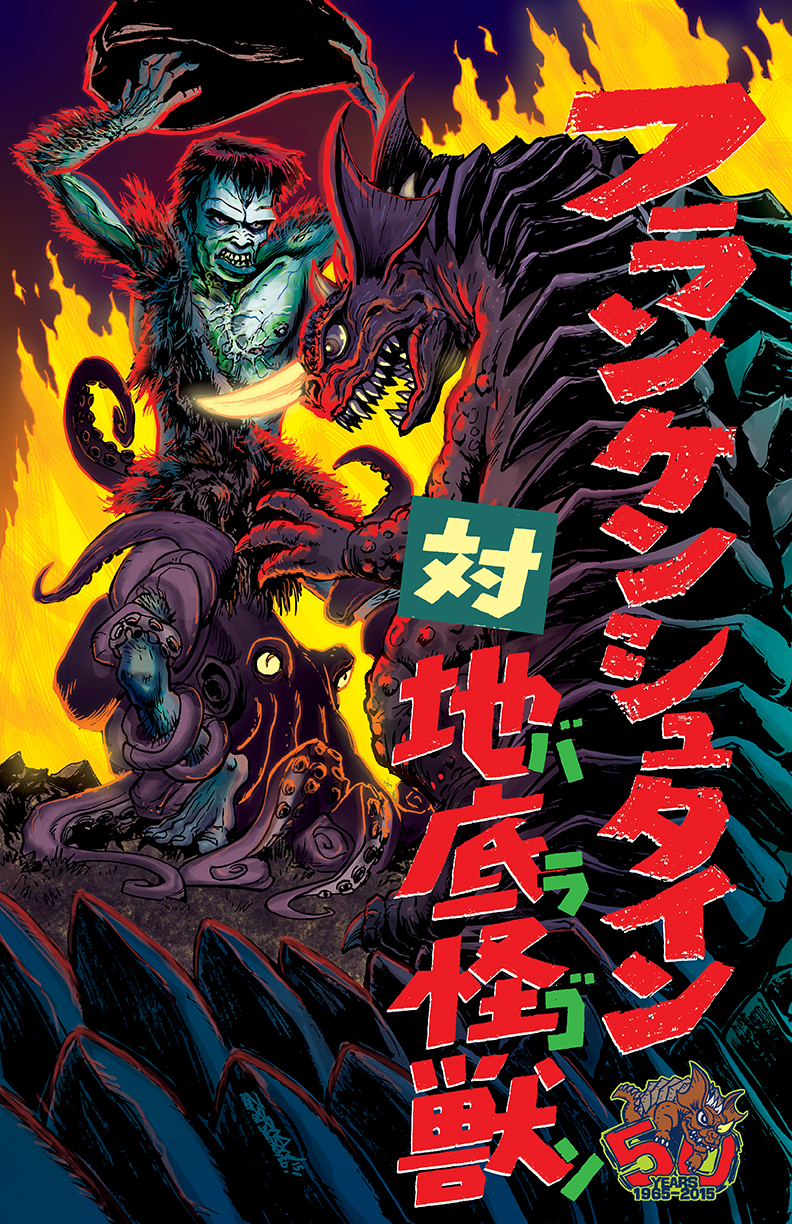 1boy anniversary baragon_(godzilla) benedict_pictures_corporation boulder character_name chibi claws copyright_name crossover dinosaur fire forest_fire frankenstein frankenstein's_monster frankenstein_(frankenstein_vs._baragon) frankenstein_vs._baragon giant giant_monster giant_octopus_(godzilla) glowing glowing_eyes glowing_horns godzilla_(series) hairy_arms hairy_legs holding holding_rock horns japanese_text jeff_zornow kaijin kaiju leg_hair lifting_object monster monster_boy octopus open_mouth revision rock sharp_teeth single_horn slit_pupils tail teeth tentacles toga toho undead veins veiny_arms veiny_chest veiny_hands weapon