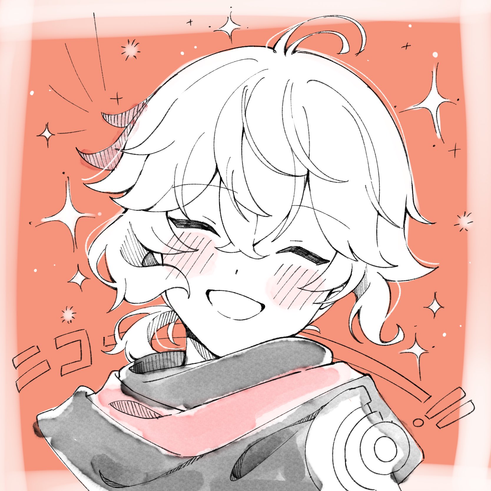 ! !! 1boy black_jacket blush border closed_eyes commentary_request crossed_bangs dot_nose double-parted_bangs genshin_impact grin highres jacket kaedehara_kazuha male_focus outside_border smile solo sparkle yuki_ma00