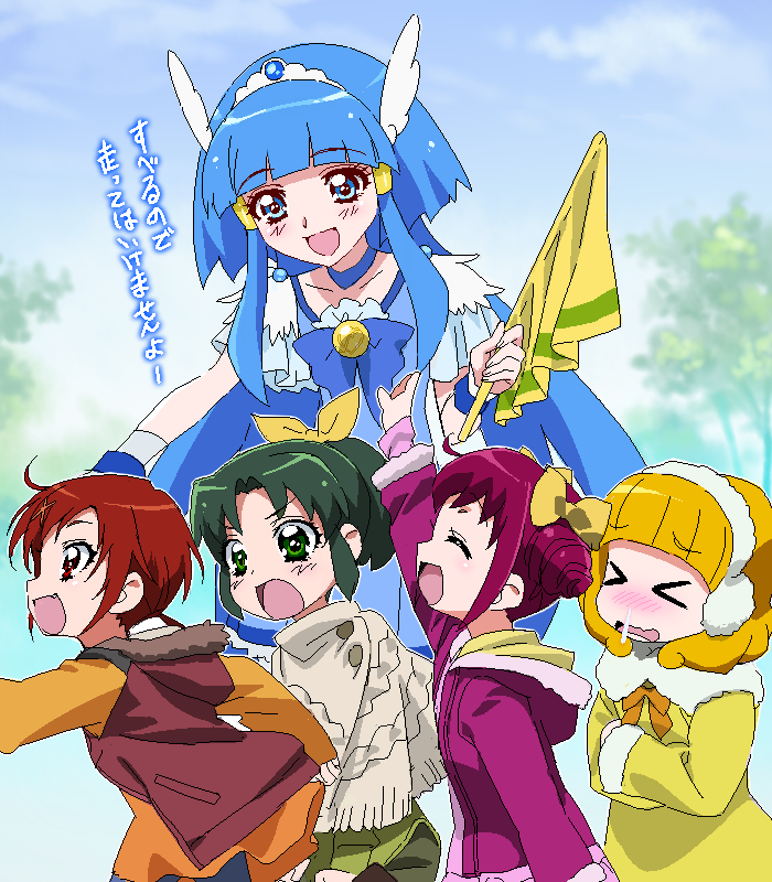 >_< age_regression aged_down aoki_reika arm_up blonde_hair blue_choker blue_dress blue_eyes blue_hair blue_sky bow brooch choker closed_eyes coat commentary cure_beauty day double_bun dress fang flag fringe_trim frown fur-trimmed_coat fur_trim gloves green_eyes green_hair green_shirt green_shorts grey_shawl hair_bow hair_bun hair_ribbon hairband head_wings hino_akane_(precure) holding holding_flag hood hood_down hooded_coat hooded_jacket hoshizora_miyuki jacket jewelry kise_yayoi leaning_forward long_hair long_sleeves looking_at_another looking_at_viewer magical_girl medium_hair midorikawa_nao open_clothes open_coat open_mouth orange_shirt outdoors pink_coat pink_hair pink_sweater pleated_dress ponytail precure red_jacket ribbon shawl shirt short_hair short_ponytail short_sleeves shorts sky sleeveless sleeveless_jacket smile smile_precure! snot standing sweater tiara tonbi translated untucked_shirt very_long_hair walking white_gloves white_hairband wings yellow_bow yellow_coat yellow_ribbon