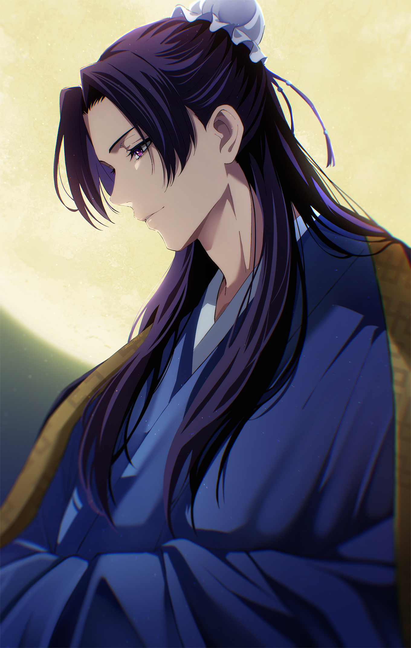 1boy beads blue_hanfu bun_cover chinese_clothes closed_mouth commentary_request full_moon hair_beads hair_bun hair_ornament hanfu highres jinshi_(kusuriya_no_hitorigoto) kusuriya_no_hitorigoto lips long_hair male_focus may_(illust_man_2020) moon parted_lips purple_eyes purple_hair solo teeth upper_body