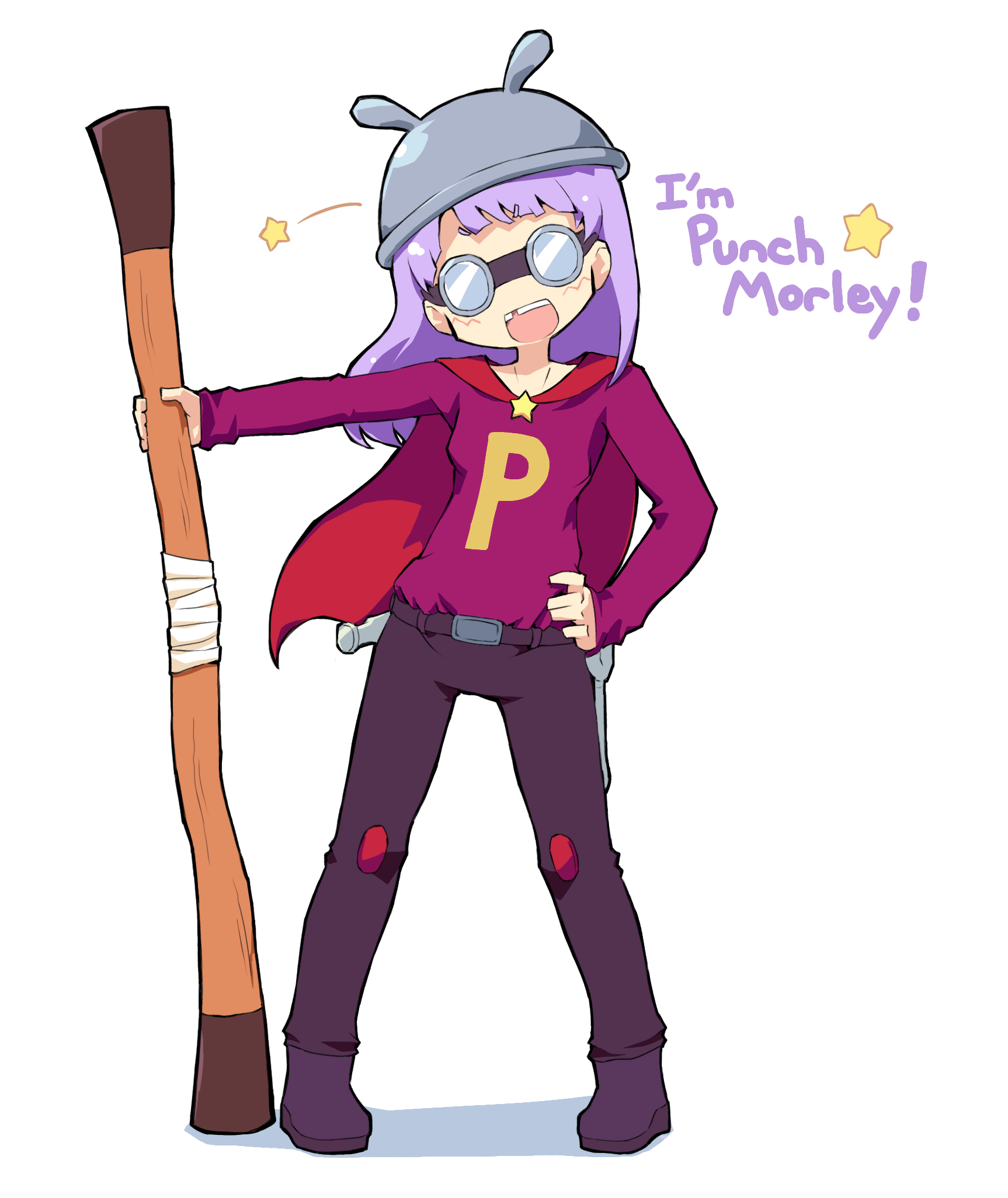 1girl 2000s_(style) animification black_pants black_shoes breasts cape character_name drawpile_(medium) english_text faux_retro_artstyle full_body genderswap genderswap_(mtf) goggles hand_on_own_hip helmet highres holding humanization long_hair long_sleeves negiwave2000 open_mouth paint_chat_(medium) pants punch_morley purple_hair purple_shirt red_cape robot_and_monster shirt shoes simple_background small_breasts solo star_(symbol) white_background