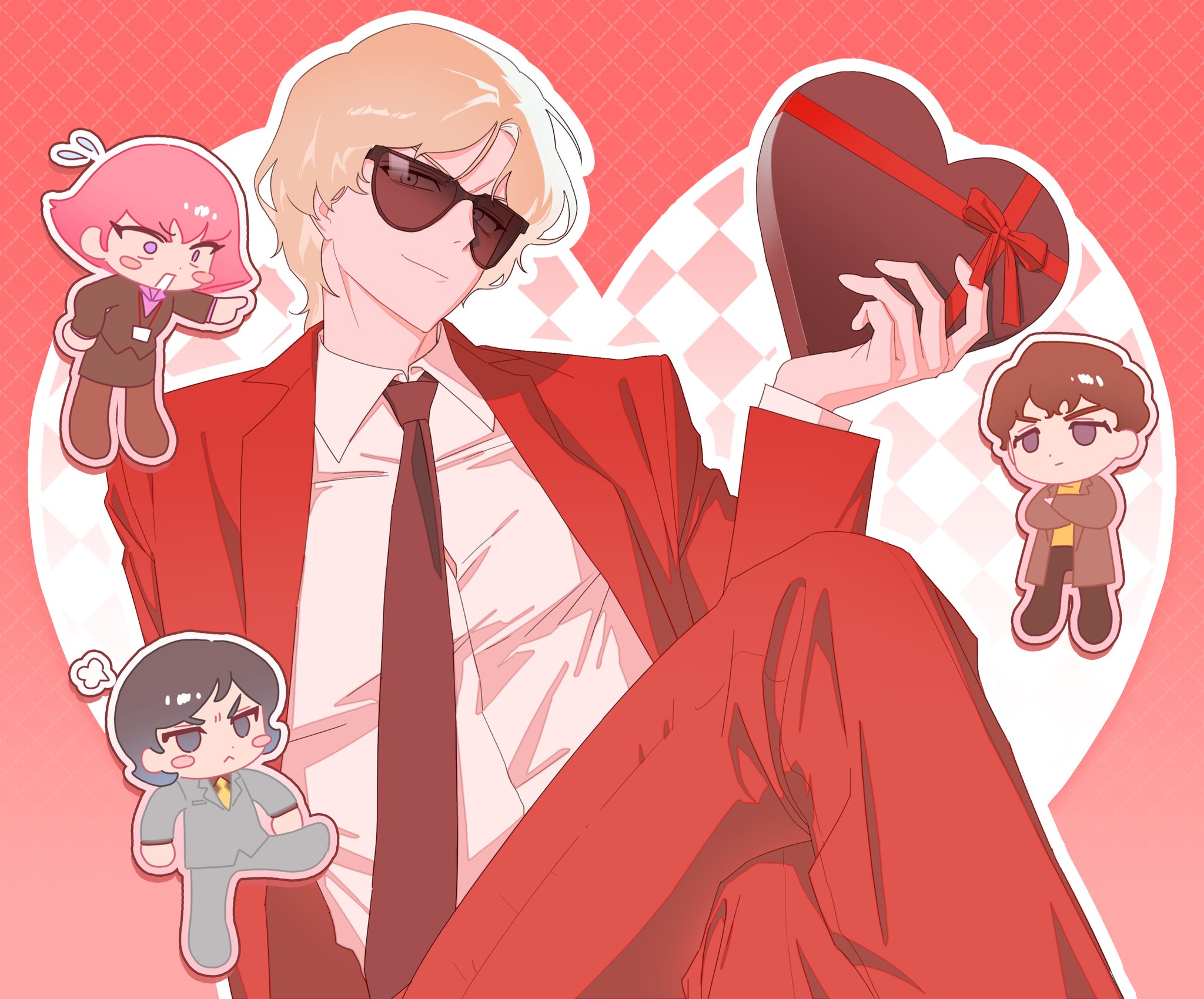 1girl 3boys :< arasa_ol_haman-sama black_jacket black_necktie black_skirt blonde_hair blue_eyes blue_jacket blue_pants blush_stickers brown_coat brown_hair brown_pants char_aznable chibi closed_mouth coat collared_shirt commentary crossed_arms crossed_legs english_commentary flying_sweatdrops frown furrowed_brow gundam haman_karn hand_on_own_hip heart heart_background highres id_card jacket judau_ashta kamille_bidan lanyard lapels long_sleeves looking_at_viewer multiple_boys necktie notched_lapels open_clothes open_coat open_mouth outline pants pink_hair pink_shirt pointing pronakser puff_of_air purple_eyes quattro_bajeena rectangular_mouth red_jacket red_pants shirt short_hair sitting skirt smile sunglasses v-shaped_eyebrows valentine white_outline white_shirt wing_collar yellow_necktie yellow_shirt