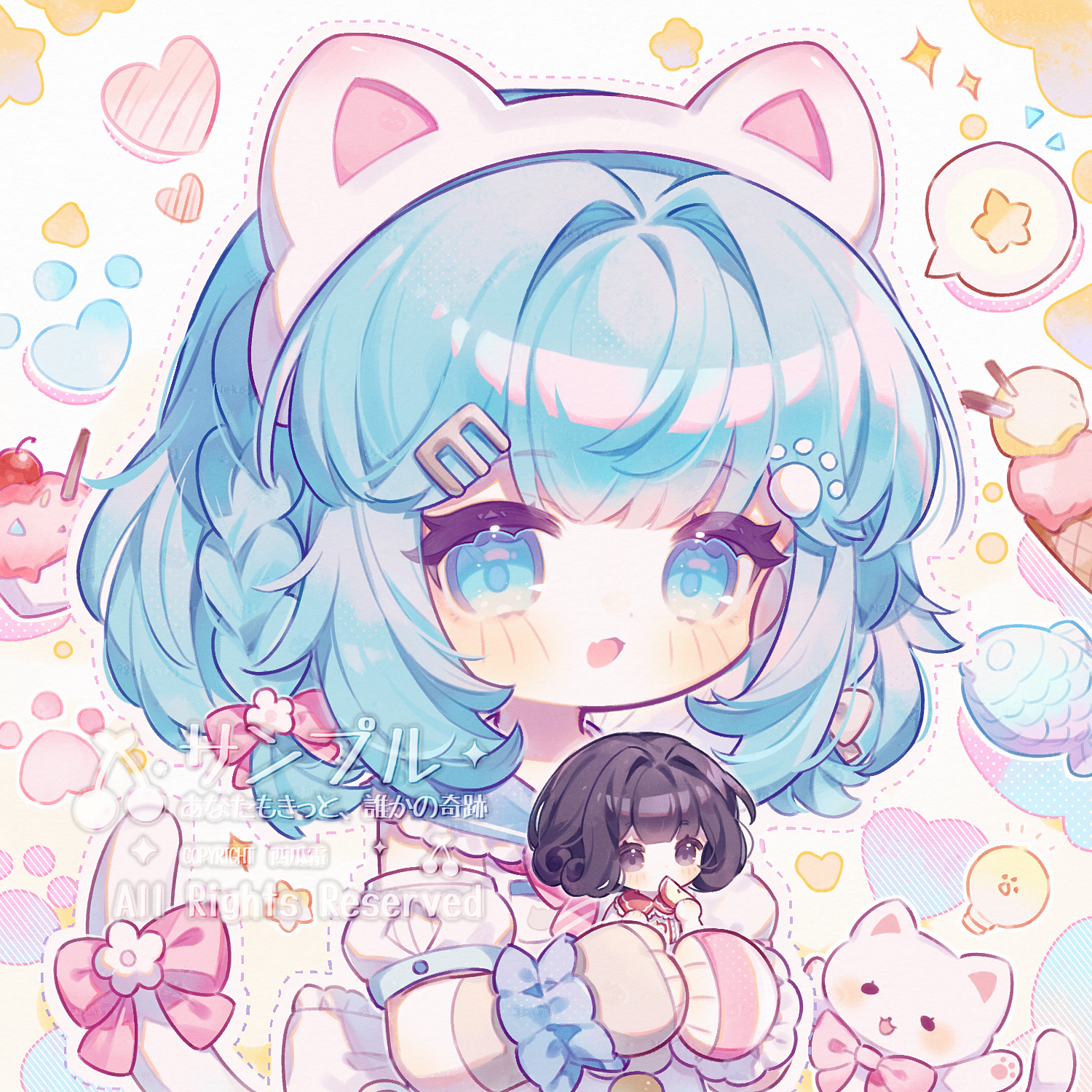 2girls animal_ear_hairband animal_ears black_eyes black_hair blue_eyes blue_hair blue_sailor_collar blush_stickers bow bowtie braid cat cat_ears cat_tail chibi chibi_only detached_sleeves dongnanbeixigua fake_animal_ears food frills hair_bow hair_ornament hairband hairclip heart highres holding holding_food ice_cream ice_cream_cone long_sleeves looking_at_viewer medium_hair multiple_girls open_mouth original paw_print pink_bow pink_bowtie pink_sleeves puffy_short_sleeves puffy_sleeves sailor_collar sample_watermark shirt short_hair short_sleeves smile speech_bubble striped_clothes tail tail_bow tail_ornament upper_body watermark white_background white_hairband white_shirt white_sleeves