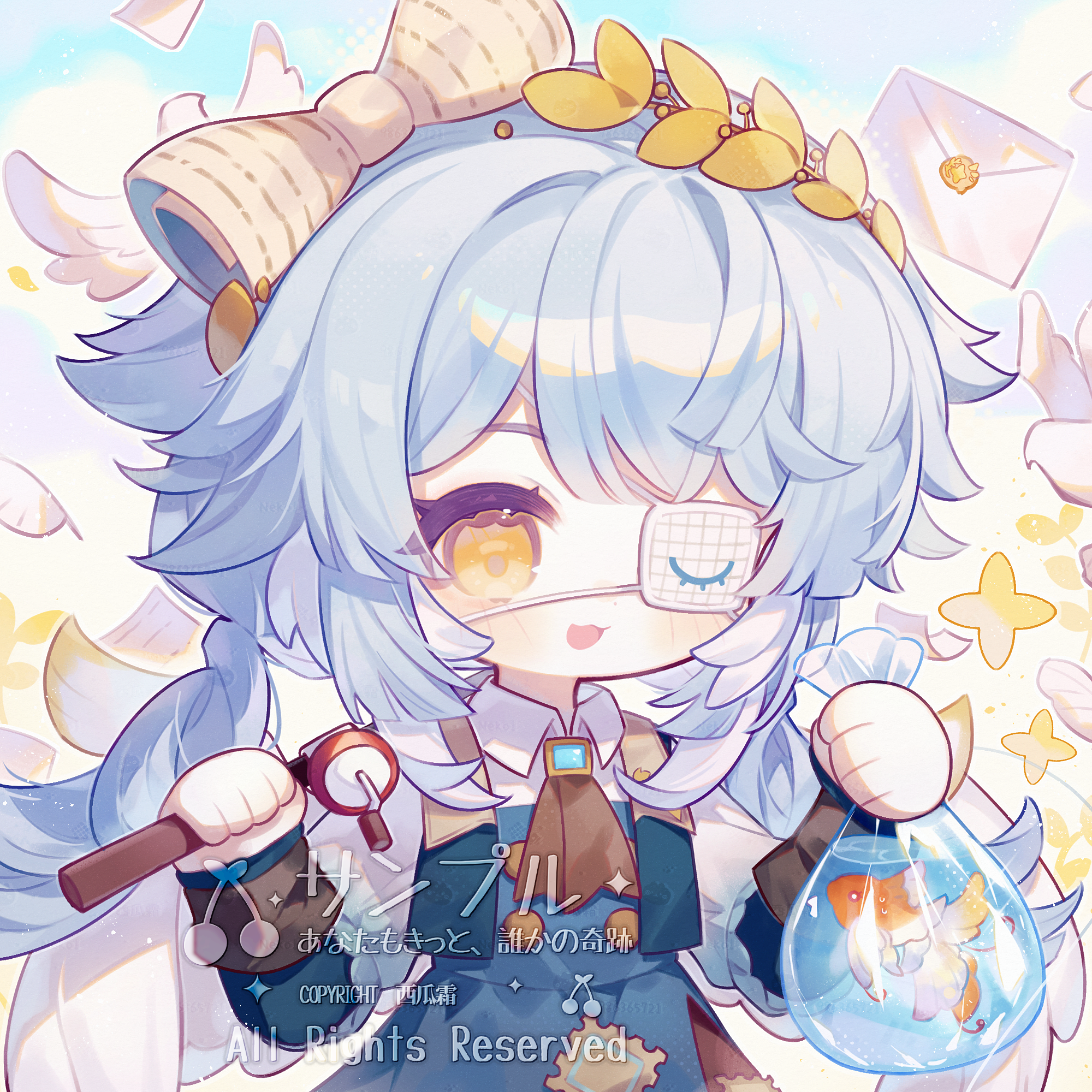 1girl :3 ascot bag blue_hair blue_skirt blue_vest bow braid chibi chibi_only collared_shirt dongnanbeixigua dress envelope eyepatch fish goldfish hair_bow hair_ornament highres holding letter long_hair long_sleeves looking_at_viewer low_twintails medical_eyepatch open_mouth original puffy_sleeves sample_watermark shirt skirt smile solo twin_braids twintails upper_body vest watermark white_bow white_shirt white_sleeves white_wings wings yellow_eyes