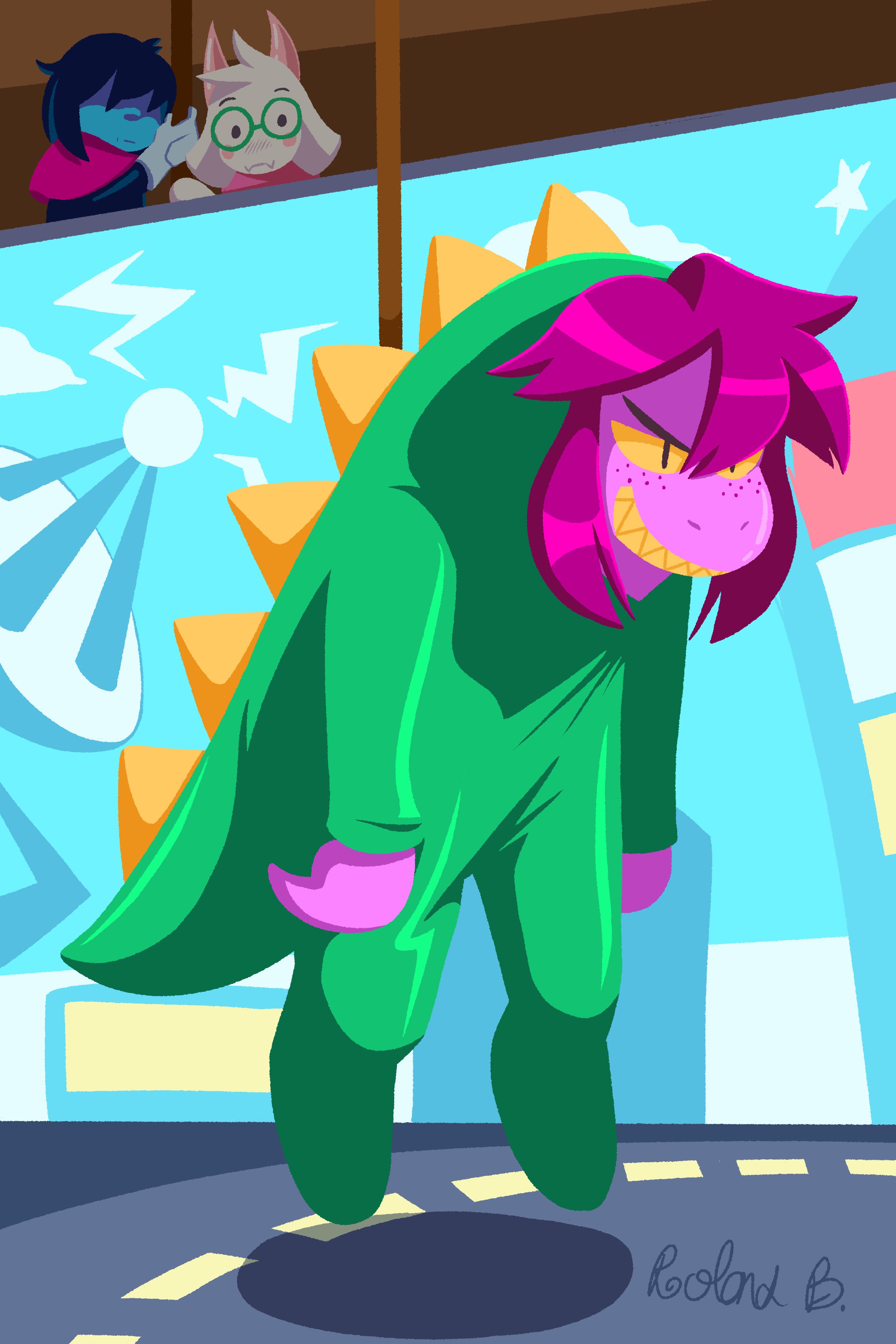 1boy 1girl 1other absurdres androgynous animal_ears black_eyes black_hair blue_skin blush closed_mouth colored_sclera colored_skin colored_teeth commentary deltarune english_commentary fangs freckles furry furry_female furry_male glasses green-framed_eyewear highres horns kris_(dark_world)_(deltarune) kris_(deltarune) long_hair long_sleeves looking_at_another no_eyes onesie open_mouth purple_hair purple_skin ralsei robablo round_eyewear shaded_face sharp_teeth short_hair skin_fangs smile susie_(dark_world)_(deltarune) susie_(deltarune) susiezilla teeth utdr_(toby_fox) yellow_sclera yellow_teeth