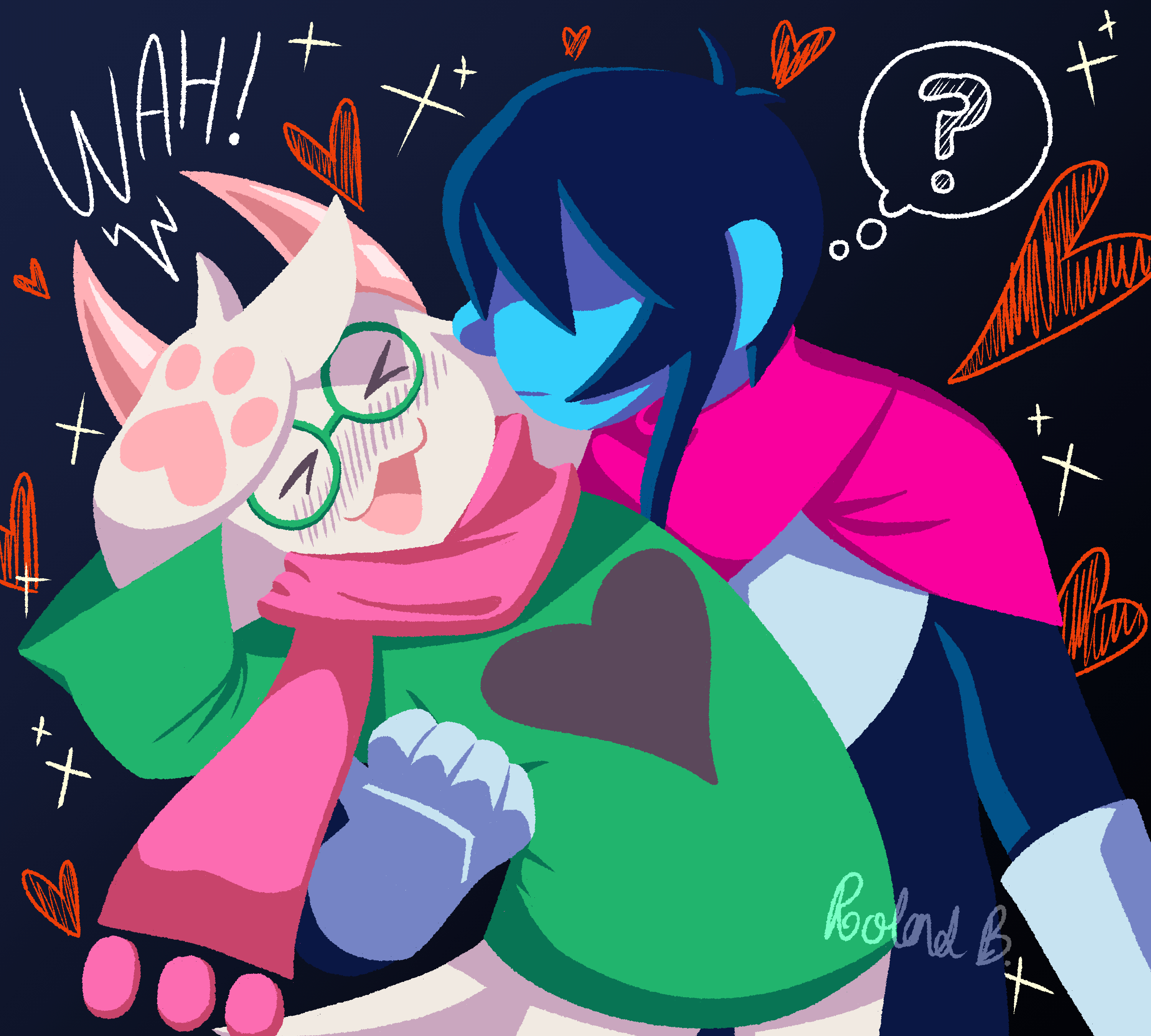 >_< 1boy 1other :3 ? absurdres animal_ears antenna_hair black_bodysuit black_hair blush bodysuit closed_mouth commentary cuirass deltarune english_commentary furry furry_male gauntlets glasses green-framed_eyewear hand_on_own_forehead heart highres horns kris_(dark_world)_(deltarune) kris_(deltarune) long_sleeves looking_at_another no_eyes open_mouth pink_scarf ralsei robablo round_eyewear scarf shaded_face short_hair smile speech_bubble spoken_question_mark thought_bubble utdr_(toby_fox) x3