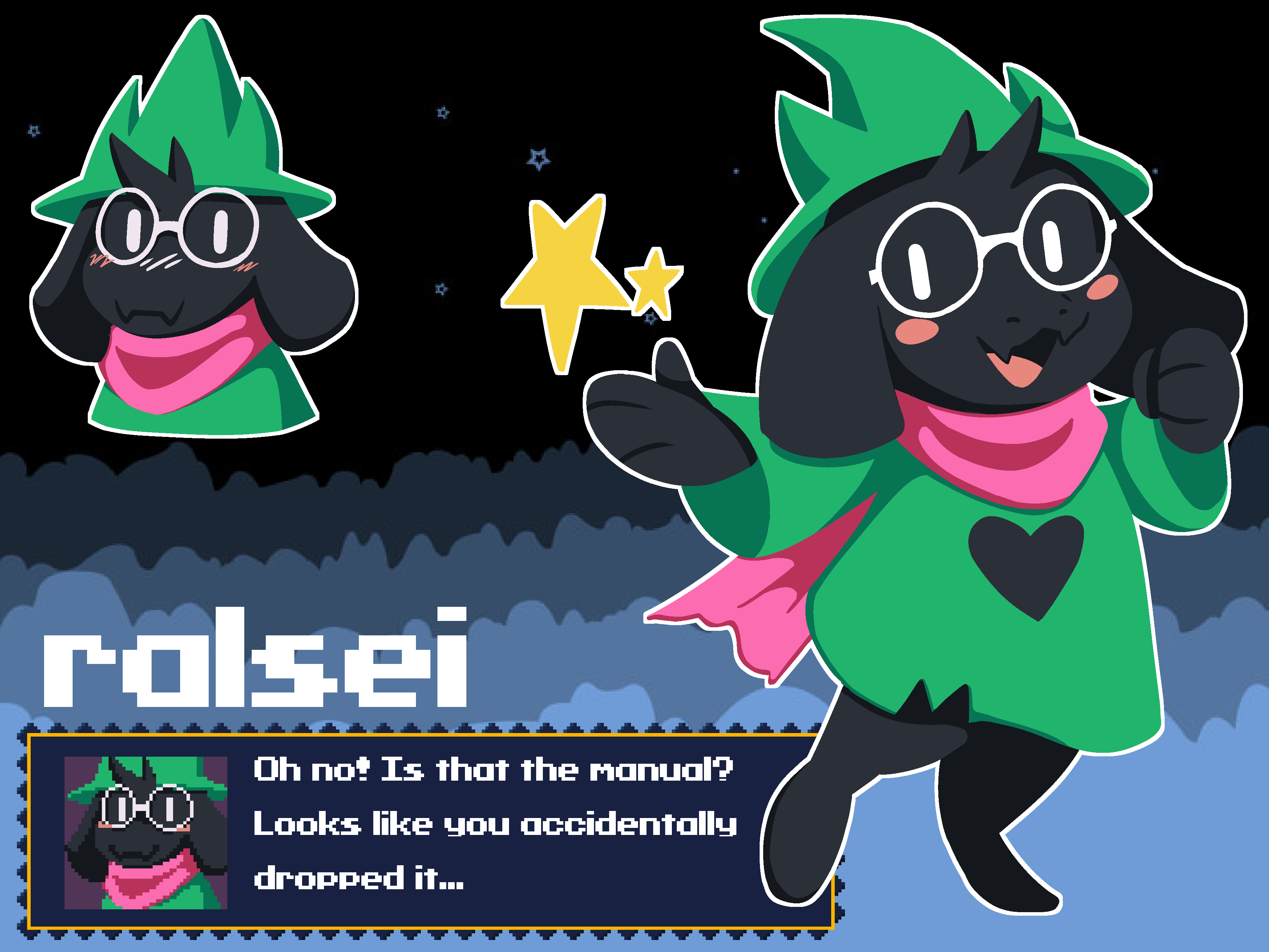 1boy absurdres animal_ears barefoot blush character_name closed_mouth commentary deltarune doukutsu_monogatari english_commentary english_text fangs glasses green_hat hat highres looking_at_viewer male_focus open_mouth outline pink_scarf ralsei ralsei_(hat) robablo round_eyewear scarf skin_fangs smile solo utdr_(toby_fox) white-framed_eyewear white_eyes white_outline