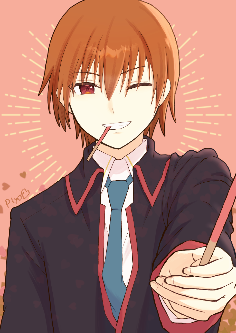 1boy ;d black_jacket blue_necktie brown_eyes brown_hair collared_shirt commentary_request emphasis_lines eyes_visible_through_hair food food_in_mouth grin hair_between_eyes heart highres holding holding_food holding_pocky jacket little_busters! little_busters!_school_uniform long_sleeves looking_at_viewer male_focus natsume_kyousuke necktie one_eye_closed open_mouth pink_background piyo_(kinkooo333) pocky pocky_in_mouth reaching reaching_towards_viewer school_uniform shirt short_hair simple_background smile solo straight-on tsurime upper_body white_shirt