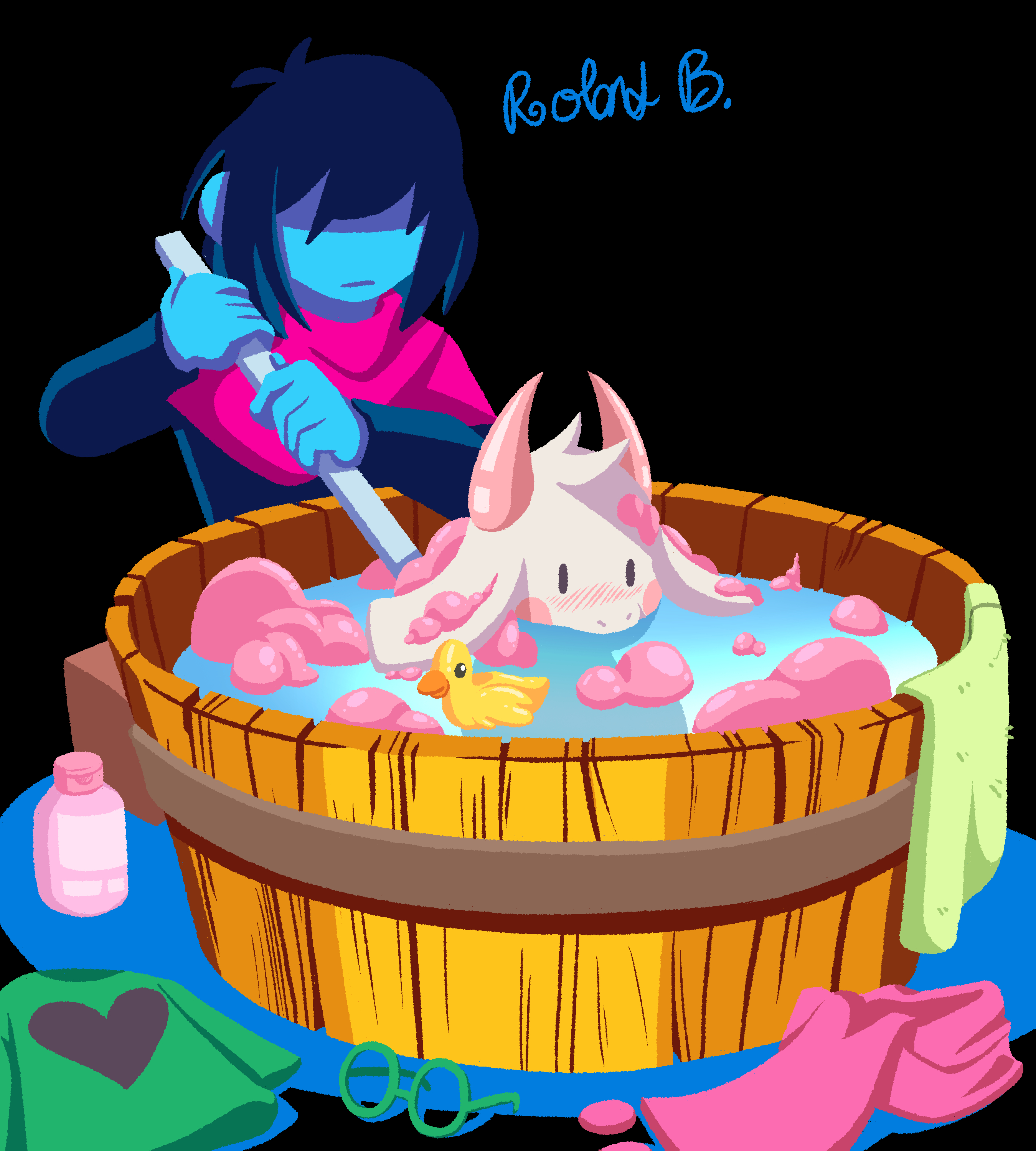 1boy 1other absurdres androgynous animal_ears antenna_hair bath black_background black_bodysuit blush bodysuit bubble_bath closed_mouth commentary deltarune english_commentary furry furry_male glasses green-framed_eyewear highres horns kris_(dark_world)_(deltarune) kris_(deltarune) no_eyes pink_scarf ralsei robablo round_eyewear rubber_duck scarf shaded_face short_hair simple_background unworn_eyewear unworn_scarf utdr_(toby_fox)