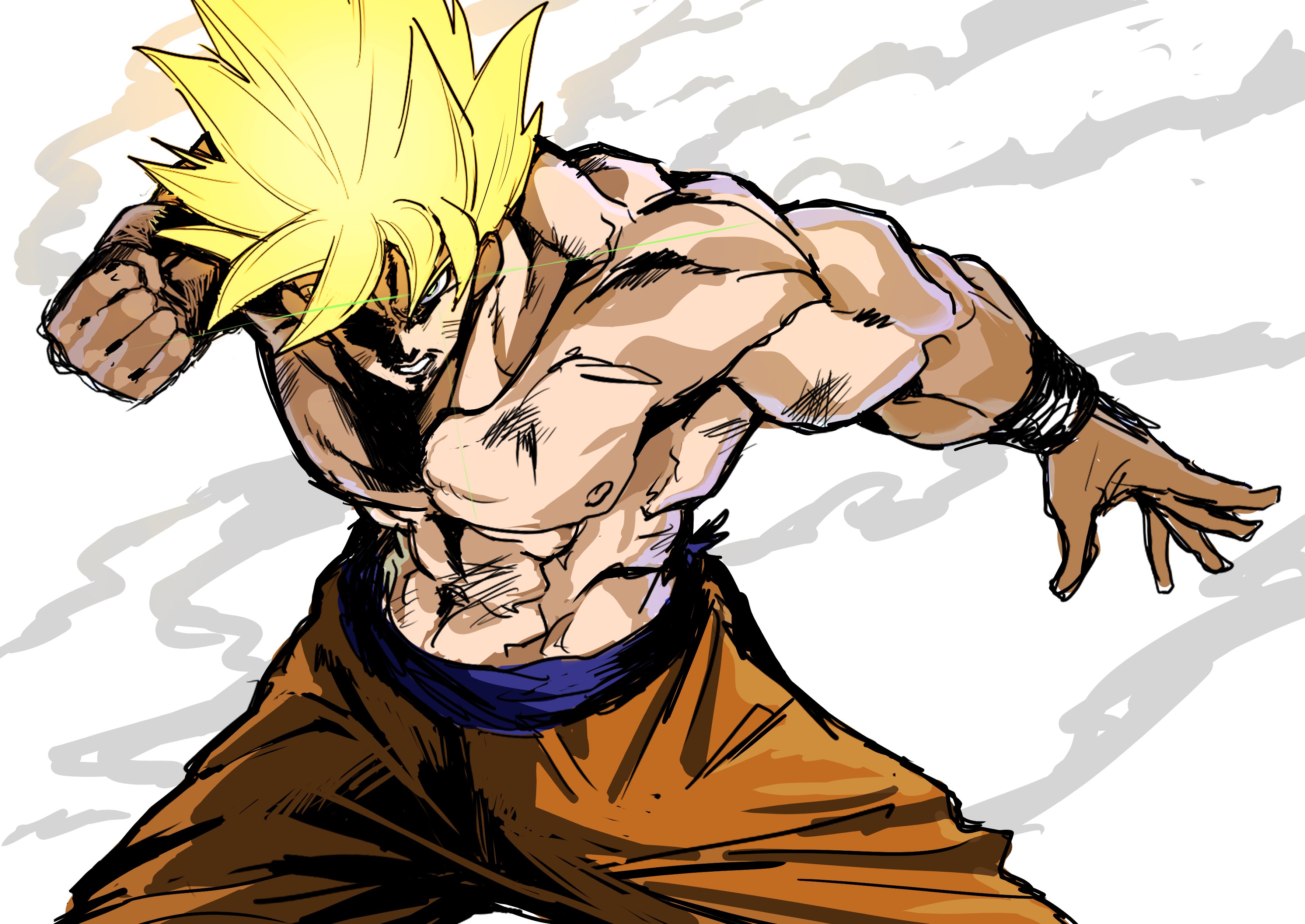 1boy absurdres blonde_hair blue_sash clenched_hand commentary_request cowboy_shot dragon_ball dragonball_z eye_trail glowing glowing_hair green_eyes highres koppepan_agp light_trail looking_at_viewer male_focus muscular muscular_male orange_pants pants partially_shaded_face sash scratches solo son_goku spiked_hair super_saiyan super_saiyan_1 topless_male wristband
