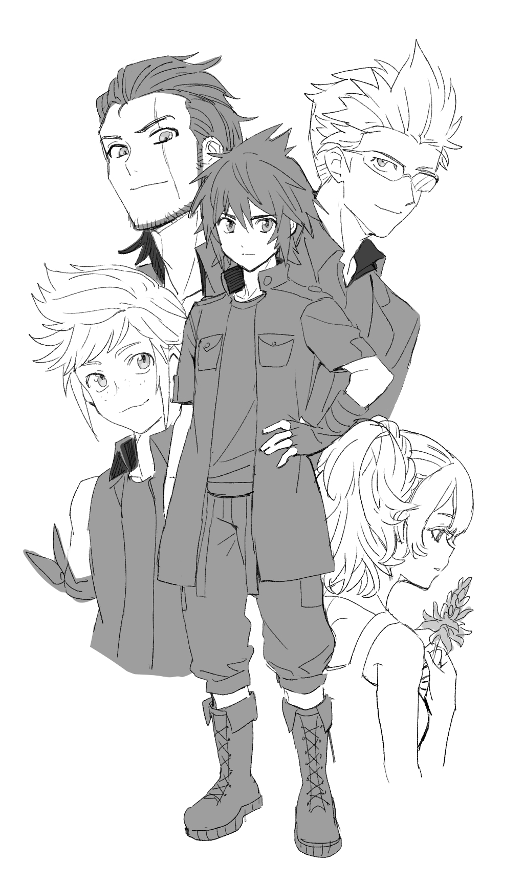 1girl 4boys arm_ribbon bare_shoulders beard black_boots black_hair black_jacket black_pants black_shirt black_vest boots braid breasts chinstrap_beard closed_mouth commentary_request dede_(qwea_00000) dress facial_hair final_fantasy final_fantasy_xv fingerless_gloves flower freckles full_body gladiolus_amicitia glasses gloves greyscale hair_between_eyes hair_slicked_back hand_on_own_hip highres holding holding_flower ignis_scientia jacket korean_commentary long_hair lunafreya_nox_fleuret medium_breasts medium_hair monochrome multiple_boys noctis_lucis_caelum pants pants_rolled_up parted_lips ponytail prompto_argentum ribbon scar scar_across_eye scar_on_face shirt short_hair sideburns single_fingerless_glove sketch sleeveless sleeveless_dress smile spiked_hair standing swept_bangs upper_body vest white_background white_dress