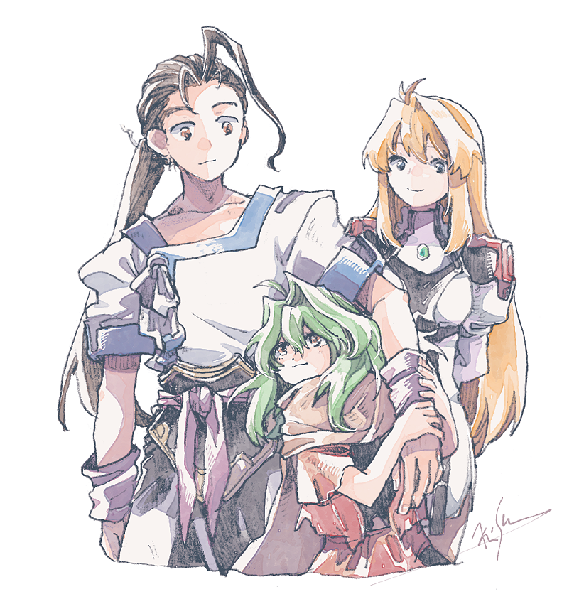 1boy 2girls ahoge arms_behind_back artist_name belt black_hair blonde_hair brown_eyes brown_scarf closed_mouth coat dress elhaym_van_houten emerada_(xenogears) fei_fong_wong green_hair hair_between_eyes holding_another's_arm long_hair michibata_65 multiple_girls ponytail purple_belt red_coat scarf smile white_background white_dress xenogears