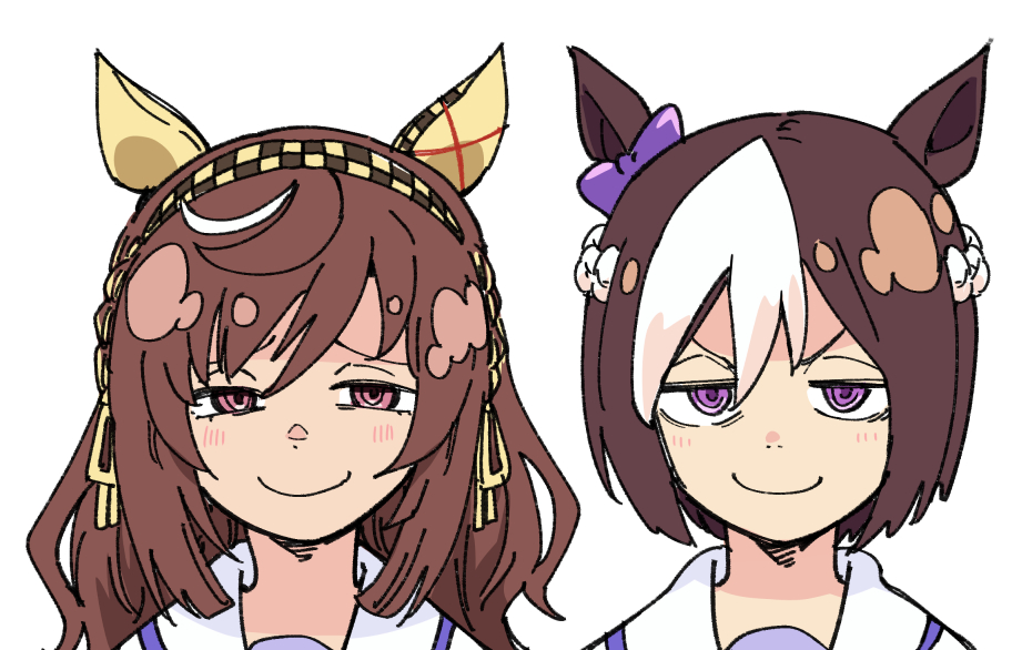 2girls animal_ears bow braid buena_vista_(umamusume) checkered_hairband closed_mouth commentary_request ear_bow ear_covers hair_between_eyes hair_ribbon hairband half_up_braid horse_ears horse_girl looking_at_viewer multiple_girls purple_bow ribbon ribbon_braid sailor_collar school_uniform short_hair side_braids simple_background smile smug special_week_(umamusume) taguchi_kenji_(omaep) tracen_school_uniform umamusume v-shaped_eyebrows white_background white_sailor_collar