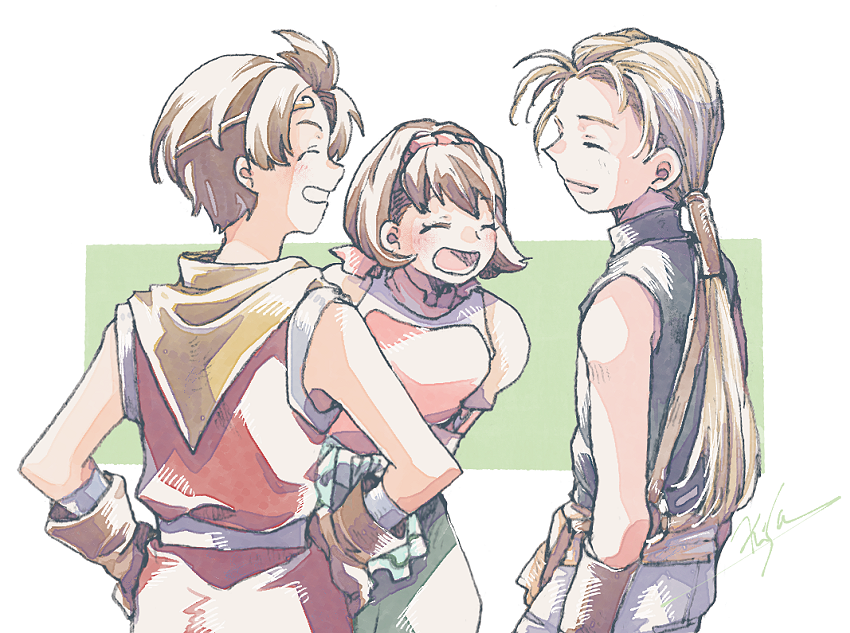 1girl 2boys artist_name bags_under_eyes bare_shoulders black_shirt border breasts brown_gloves closed_eyes cowboy_shot gensou_suikoden gensou_suikoden_ii gloves green_background green_pants hair_tubes hairband hands_on_own_hips jowy_atreides-blight laughing leaning_forward long_hair low_ponytail medium_breasts michibata_65 multiple_boys nanami_(suikoden) neckerchief open_mouth pants parted_bangs parted_lips pink_hairband pink_shirt ponytail puffy_short_sleeves puffy_sleeves red_tunic riou_(suikoden) shirt short_hair short_sleeves sleeveless sleeveless_shirt smile tunic white_border white_pants yellow_neckerchief
