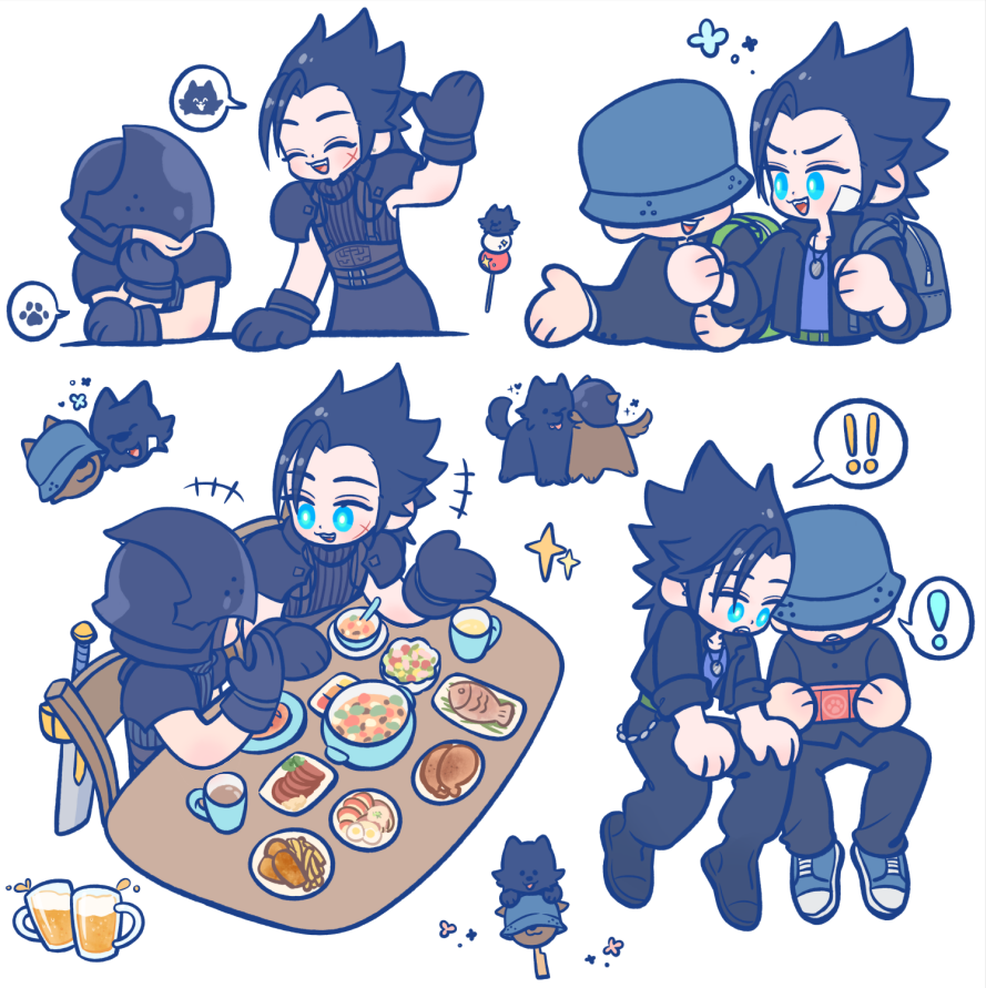 ! !! 105zz 2boys animalization aqua_eyes backpack bag bandaid bandaid_on_cheek bandaid_on_face beer_mug black_gloves black_hair black_jacket black_pants black_pantyhose black_shoes blue_shorts chibi chibi_only clenched_hands commentary_request covered_eyes crisis_core:_final_fantasy_vii cross_scar cup dango dog dog_tags facial_scar final_fantasy final_fantasy_vii final_fantasy_vii:_ever_crisis food gloves green_bag grey_bag hair_slicked_back handheld_game_console head_on_hand helmet helmet_over_eyes holding holding_handheld_game_console jacket kunsel male_focus medium_hair mug multiple_boys multiple_views official_alternate_costume pants pantyhose parted_bangs paw_print purple_shirt ribbed_shirt sanshoku_dango scar scar_on_cheek scar_on_face school_uniform shirt shoes shorts sideburns sneakers spoken_exclamation_mark suspenders taiyaki toasting_(gesture) wagashi waving white_background zack_fair zack_fair_(midgard_seventh_high_school)