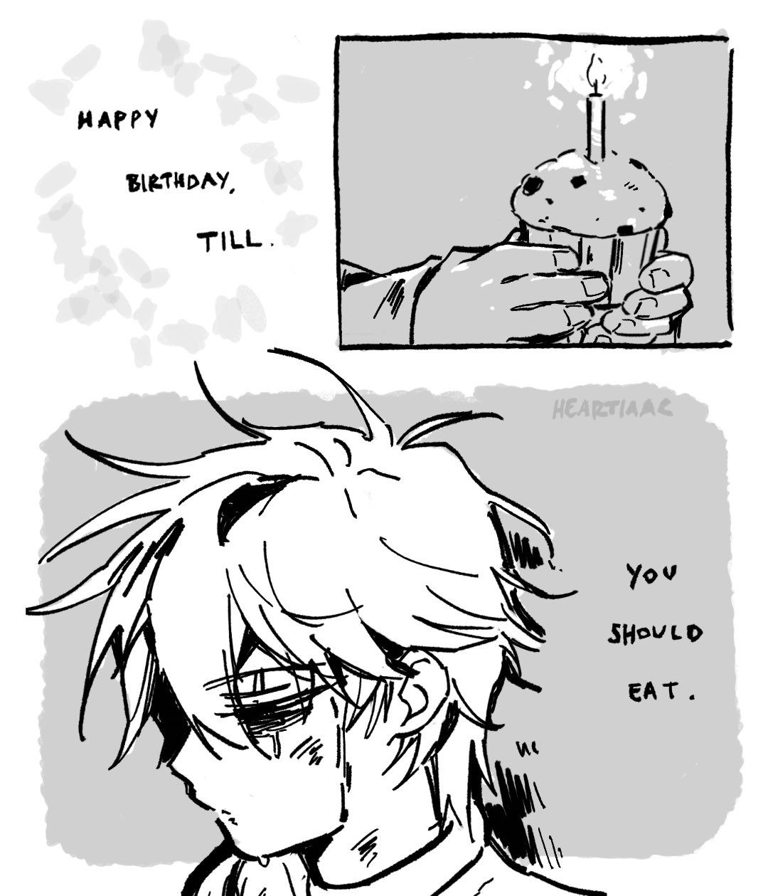 1boy alien_stage artist_name birthday candle crying cupcake english_text food greyscale happy_birthday heartiaac highres holding holding_food messy_hair monochrome short_hair signature third-party_source till_(alien_stage)
