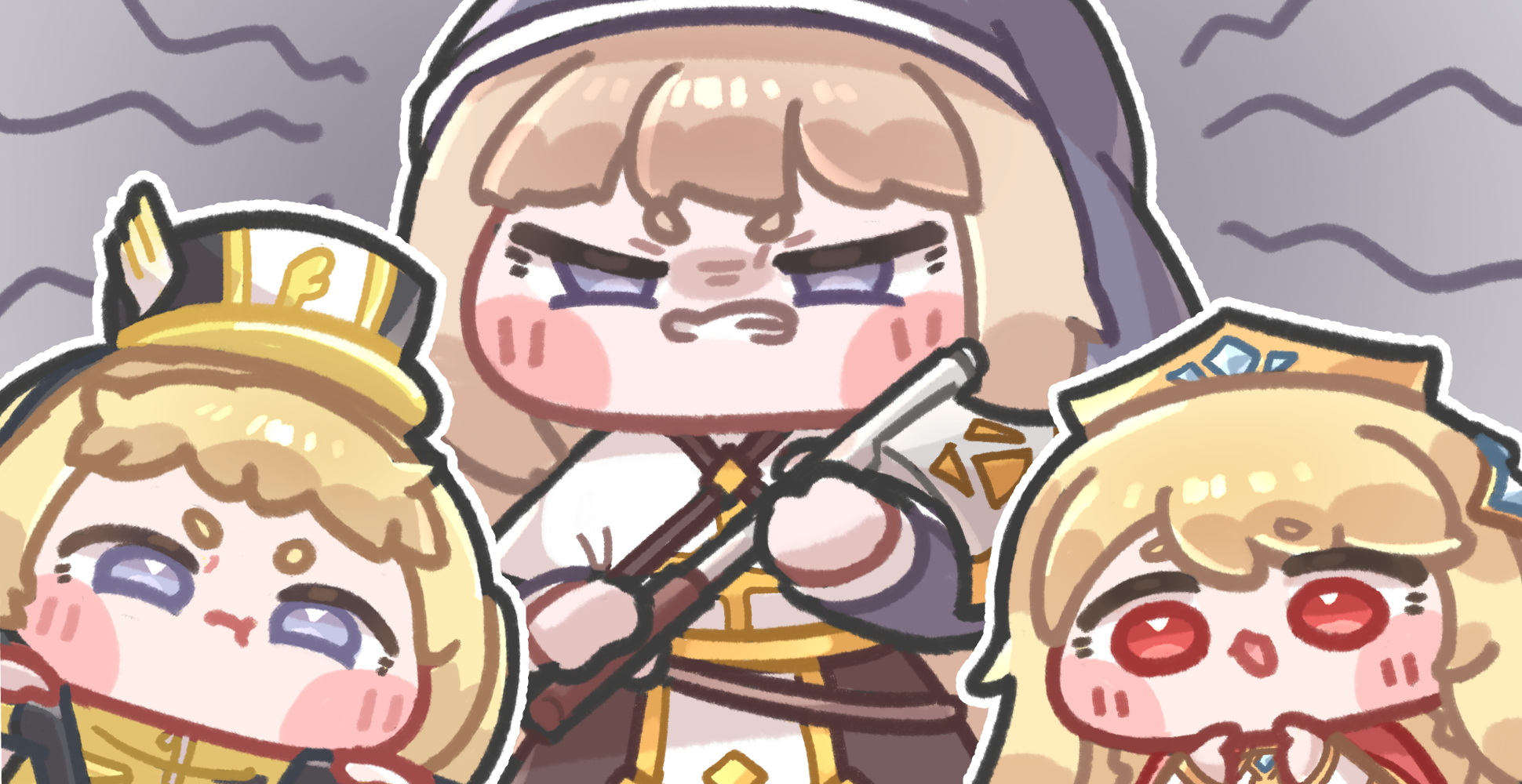3girls angry axe brown_hair chibi chibi_only clenched_teeth commentary_request crown erpin_(trickcal) grey_background hat highres holding holding_axe korean_commentary long_hair monyami multiple_girls ner_(trickcal) outline pout red_eyes shoupan_(trickcal) teeth trickcal white_outline winged_hat