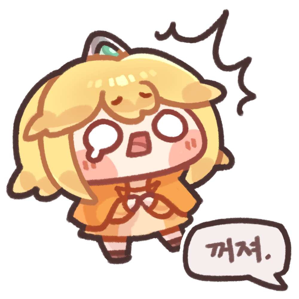 1girl blank_eyes blonde_hair blush_stickers capelet chibi commentary_request full_body guardian_tales korean_commentary korean_text little_princess_(guardian_tales) monyami open_mouth orange_capelet simple_background solo speech_bubble surprised tiara translation_request white_background