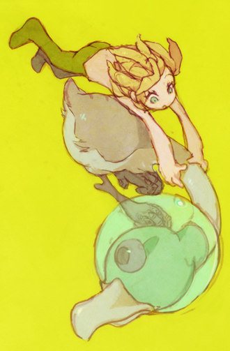 bird blonde_hair blue_eyes full_body green_pants kaiba kaiba_(character) male_focus msh pants simple_background solo topless_male yellow_background