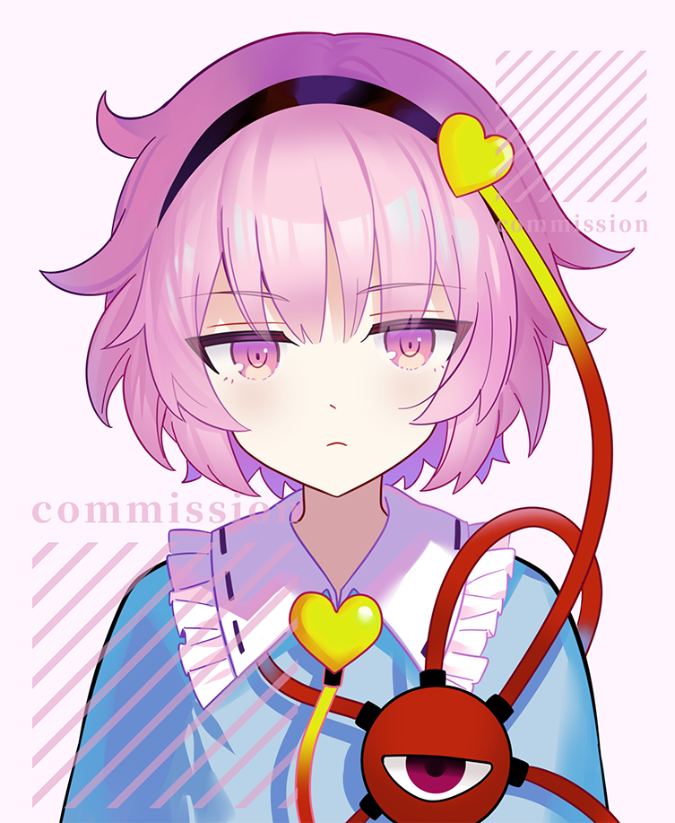 1girl black_hairband blue_shirt closed_mouth collared_shirt commentary_request commission expressionless frilled_shirt_collar frills hairband komeiji_satori looking_at_viewer pink_eyes pink_hair portrait shieryue1225 shirt short_hair solo third_eye touhou