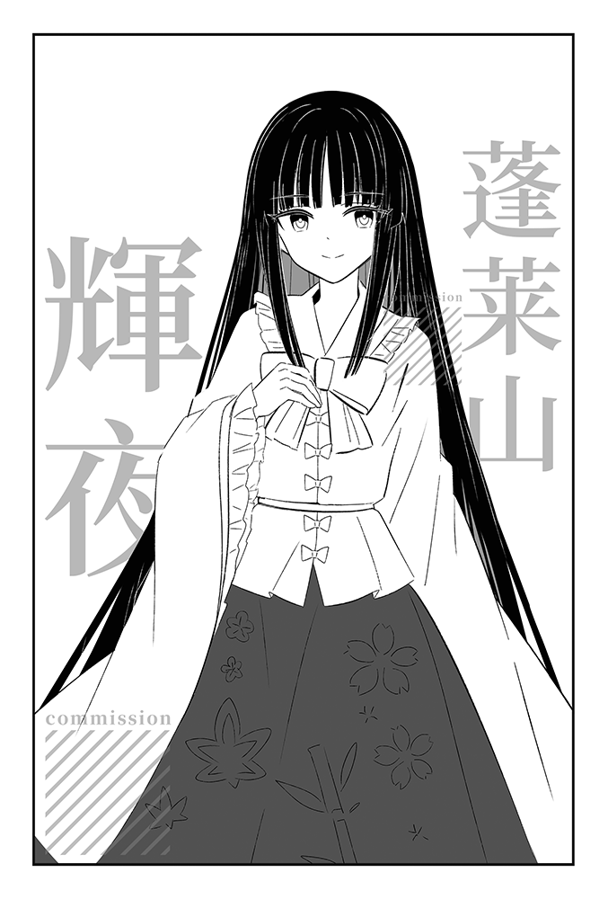 1girl black_hair bow_button closed_mouth collared_shirt commentary_request commission cowboy_shot floral_print floral_print_skirt frilled_shirt_collar frilled_sleeves frills greyscale hand_up houraisan_kaguya long_hair long_skirt long_sleeves looking_at_viewer monochrome print_skirt shieryue1225 shirt skirt smile solo standing touhou very_long_hair watermark wide_sleeves