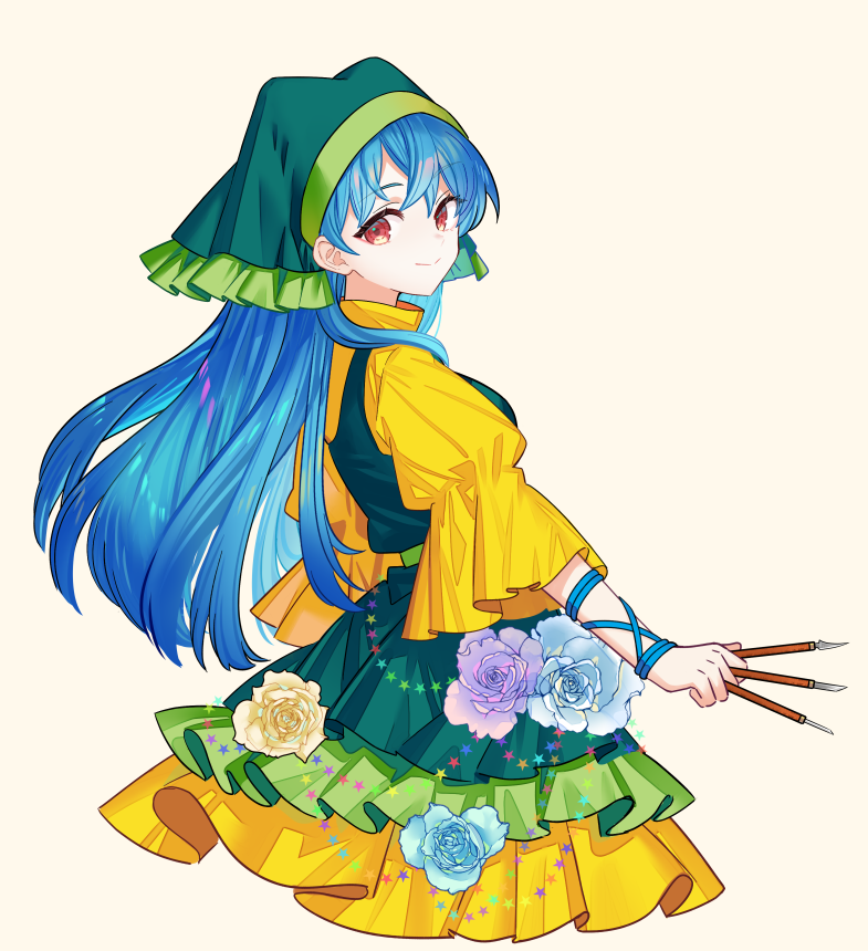 1girl between_fingers blue_flower blue_hair blue_rose closed_mouth commentary_request cropped_legs dress dress_flower flower frilled_dress frilled_headwear frilled_sleeves frills from_behind green_dress green_headscarf grey_background haniyasushin_keiki headscarf holding long_hair looking_at_viewer purple_flower purple_rose red_eyes rose shieryue1225 simple_background sleeveless sleeveless_dress smile solo three-quarter_sleeves touhou turning_head turtleneck turtleneck_dress yellow_dress yellow_flower yellow_rose