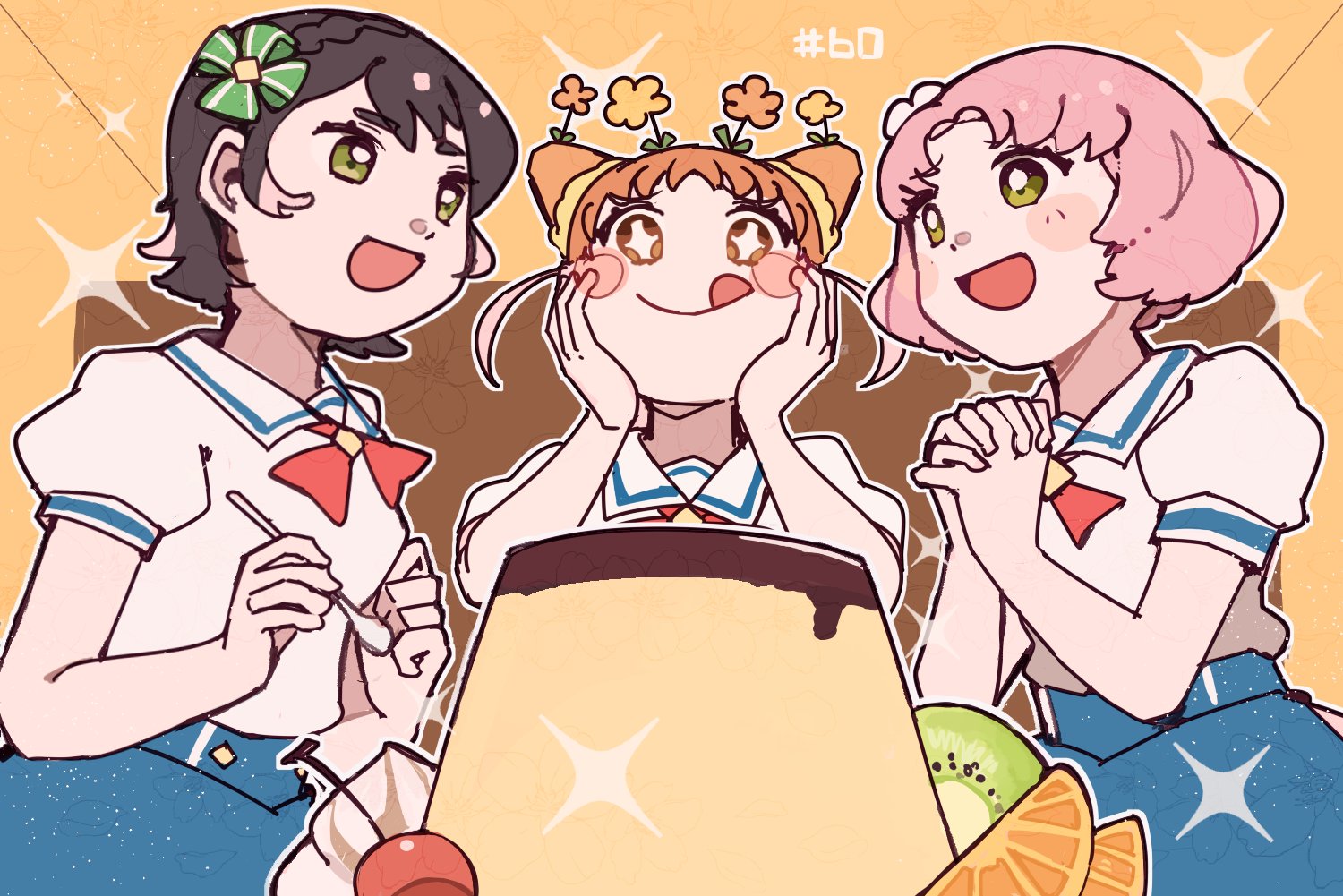 +_+ 3girls :d :q aikatsu! aikatsu!_(series) arisugawa_otome black_hair blue_skirt brown_eyes cherry commentary_request cone_hair_bun cowboy_shot cream double_bun excited flower food fruit green_eyes hair_bun hair_flower hair_ornament hands_up interlocked_fingers kamiya_shion kitaoji_sakura kiwi_(fruit) kiwi_slice looking_at_viewer multiple_girls neck_ribbon open_mouth orange_(fruit) orange_hair orange_slice outline own_hands_together pink_hair pudding red_ribbon ribbon sailor_collar school_uniform serafuku shirt short_hair sitting skirt smile sparkle starlight_academy_school_uniform summer_uniform tongue tongue_out white_outline white_sailor_collar white_shirt yukikokoro