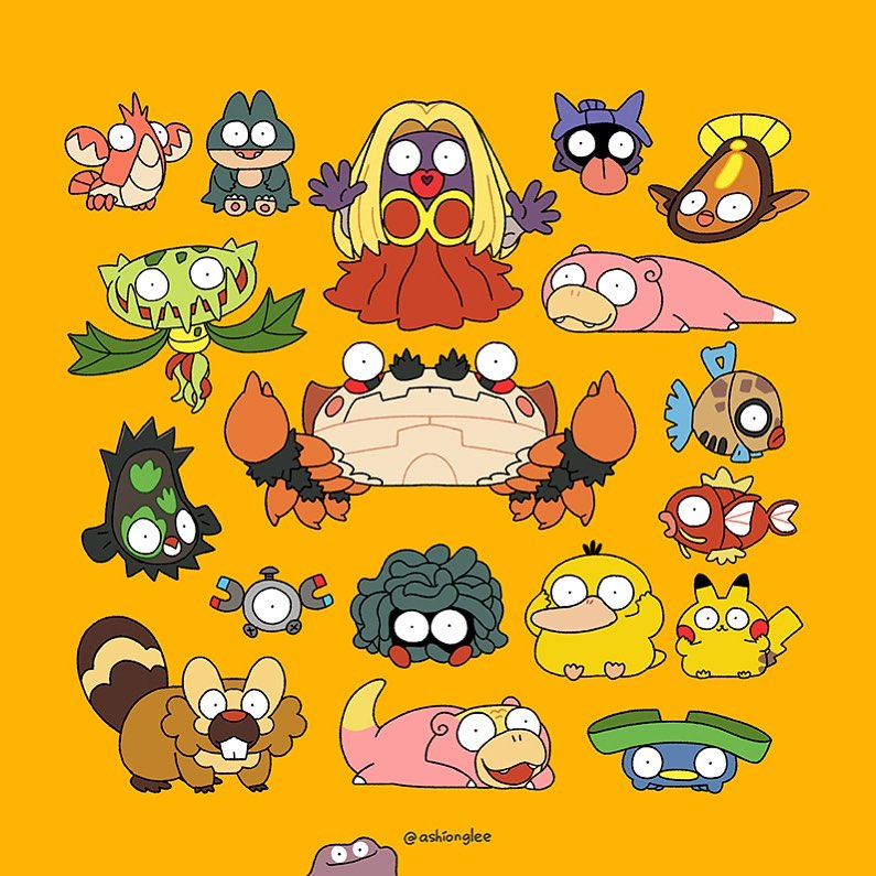 1girl :3 ashionglee bibarel blonde_hair buck_teeth carnivine closed_mouth colored_skin commentary corphish ditto dress fangs feebas flat_color full_body galarian_form galarian_slowpoke galarian_stunfisk gen_1_pokemon gen_3_pokemon gen_4_pokemon gen_5_pokemon gen_8_pokemon hair_intakes instagram_username jynx klawf long_hair lotad lying magikarp magnemite magnet munchlax nintendo nostrils on_stomach one-eyed open_mouth pikachu pokemon pokemon_(creature) pokemon_focus psyduck purple_skin red_dress red_lips screw shellder simple_background sitting slowpoke smile stunfisk tangela teeth tongue tongue_out wide-eyed yellow_background