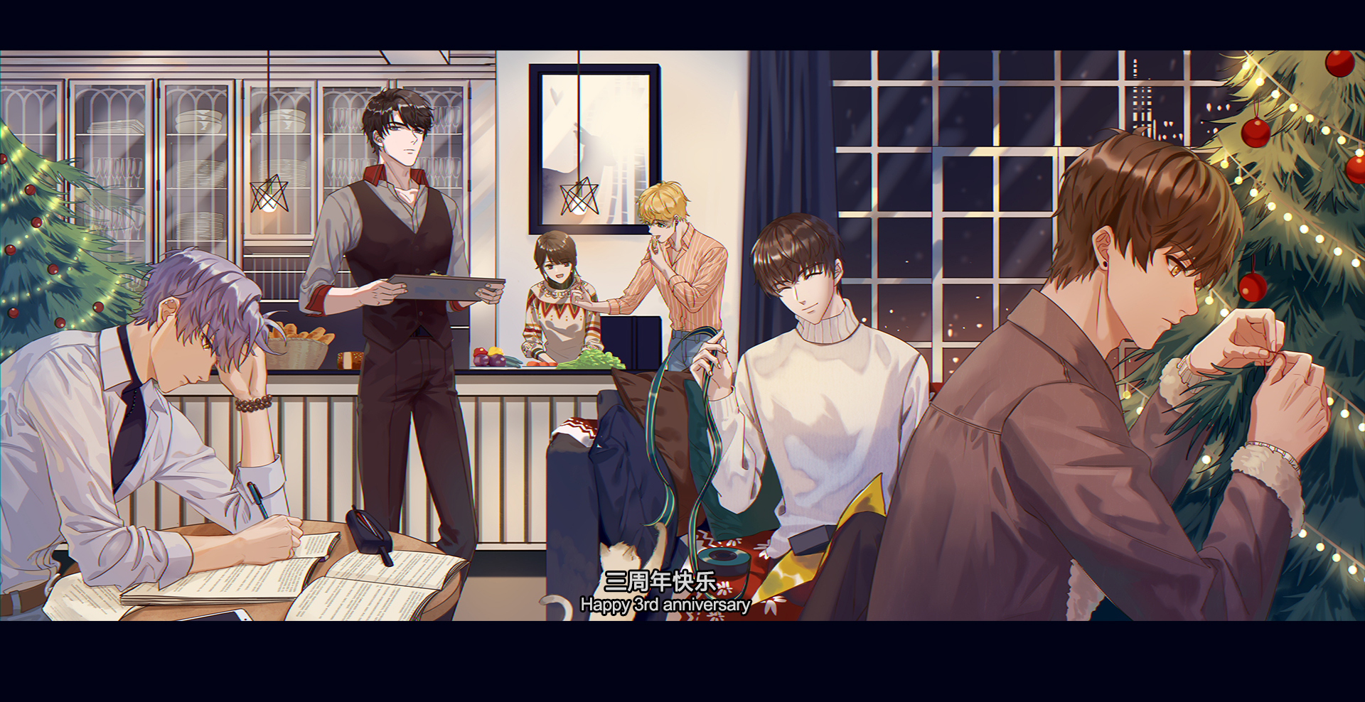 1girl 5boys ^_^ baguette bai_qi_(love_and_producer) basket bead_bracelet beads belt black_border black_hair black_pants black_shirt black_vest blonde_hair blue_eyes blue_pants book border bracelet bread brown_belt brown_hair brown_jacket cabinet cat cellphone chinese_commentary chinese_text christmas christmas_lights christmas_ornaments christmas_sweater christmas_tree closed_eyes closed_mouth collared_shirt commentary_request concentrating contrast_collar cooking couch counter crossed_legs curtains cushion decorating_christmas_tree earrings english_text expressionless feeding feet_out_of_frame food fur-trimmed_jacket fur_trim gift_wrapping green_ribbon grey_shirt hair_between_eyes hanging_light happy_anniversary highres holding holding_pen holding_ribbon holding_tray indoors jacket jewelry jiemuye letterboxed lettuce li_zeyan ling_xiao long_sleeves looking_at_another looking_to_the_side love_and_producer multiple_boys muntins night notebook on_couch open_book open_collar orange_shirt pants partially_unbuttoned pen pencil_case phone photo_(object) profile protagonist_(love_and_producer) purple_hair ribbon ribbon_spool round_table shirt short_hair sideways_glance sitting sleeves_rolled_up smartphone smile spool standing striped_clothes striped_shirt stud_earrings sweater table tray turtleneck turtleneck_sweater undershirt upper_body vegetable vertical-striped_clothes vertical-striped_shirt vest white_cat white_shirt white_sweater window wing_collar wooden_table writing xu_mo yellow_eyes yellow_sweater zhou_quiluo