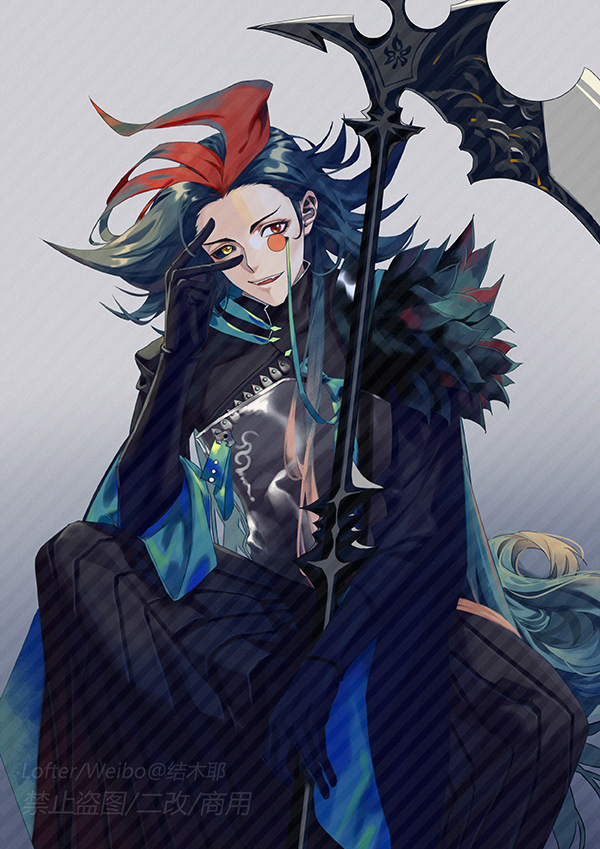 :d black_gloves black_jacket black_robe black_sclera blue_hair chili_oil_chicken_(the_tale_of_food) chinese_commentary colored_sclera commentary_request ear_piercing elbow_gloves feet_out_of_frame flipped_hair fur-trimmed_jacket fur_trim gloves gradient_background green_hair grey_background hair_slicked_back hand_on_own_face heterochromia holding holding_scythe jacket jiemuye long_hair long_sleeves looking_at_viewer male_focus mismatched_sclera monocle multicolored_hair open_mouth piercing red_eyes red_hair robe scythe see-through_clothes see-through_jacket sharp_teeth sitting smile solo spread_legs streaked_hair teeth the_tale_of_food three-quarter_sleeves very_long_hair wide_sleeves yellow_eyes