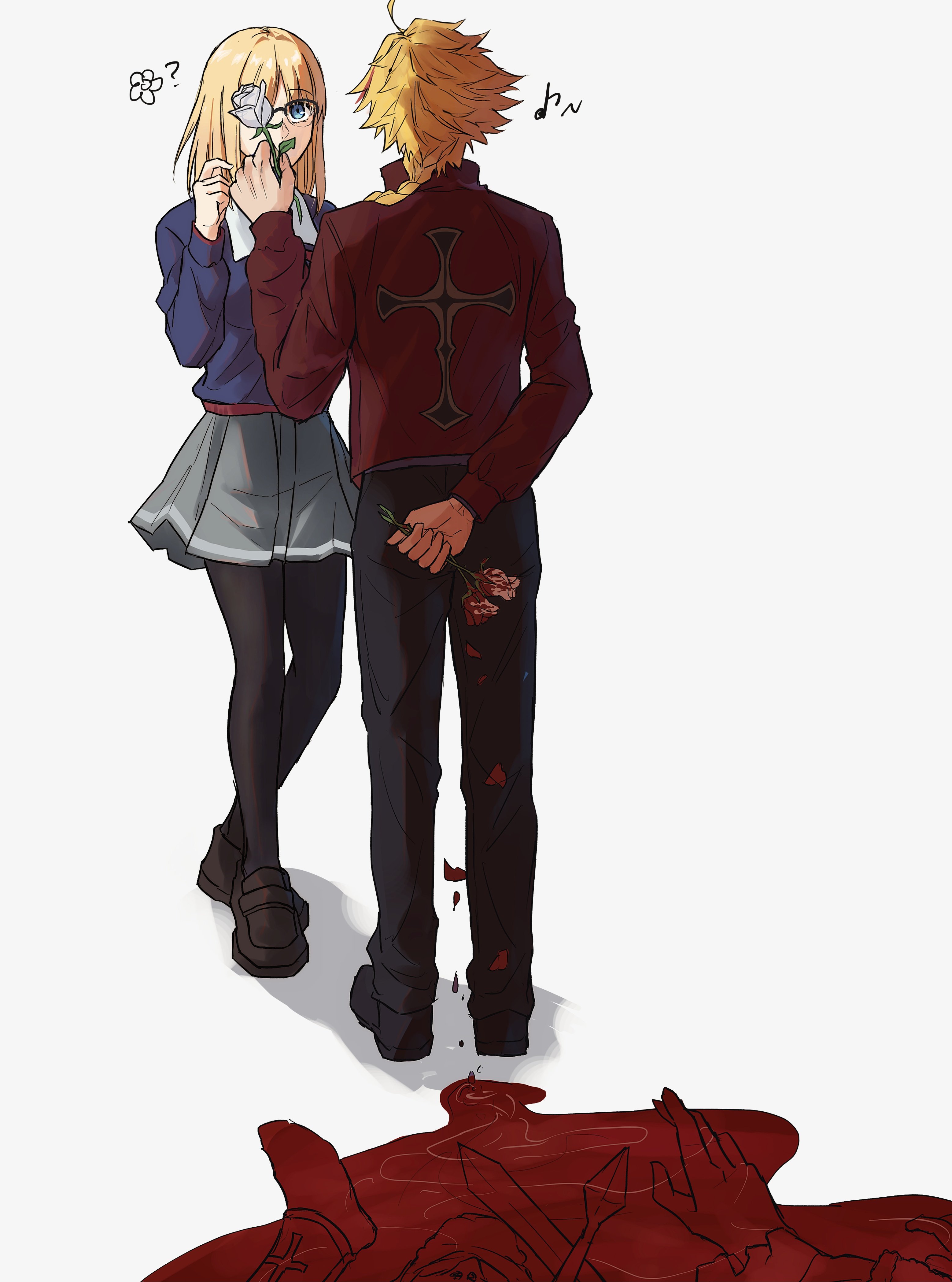 1boy 1girl absurdres ahoge blonde_hair blood blue_eyes braid braided_ponytail collared_shirt commentary_request doushittano fate/strange_fake fate_(series) flower full_body glasses highres holding holding_flower jacket korean_commentary medium_hair multicolored_hair pants pantyhose pool_of_blood red_streaks richard_i_(fate) sajou_ayaka_(fate/strange_fake) shirt side_braid single_braid skirt standing streaked_hair sweater white_background