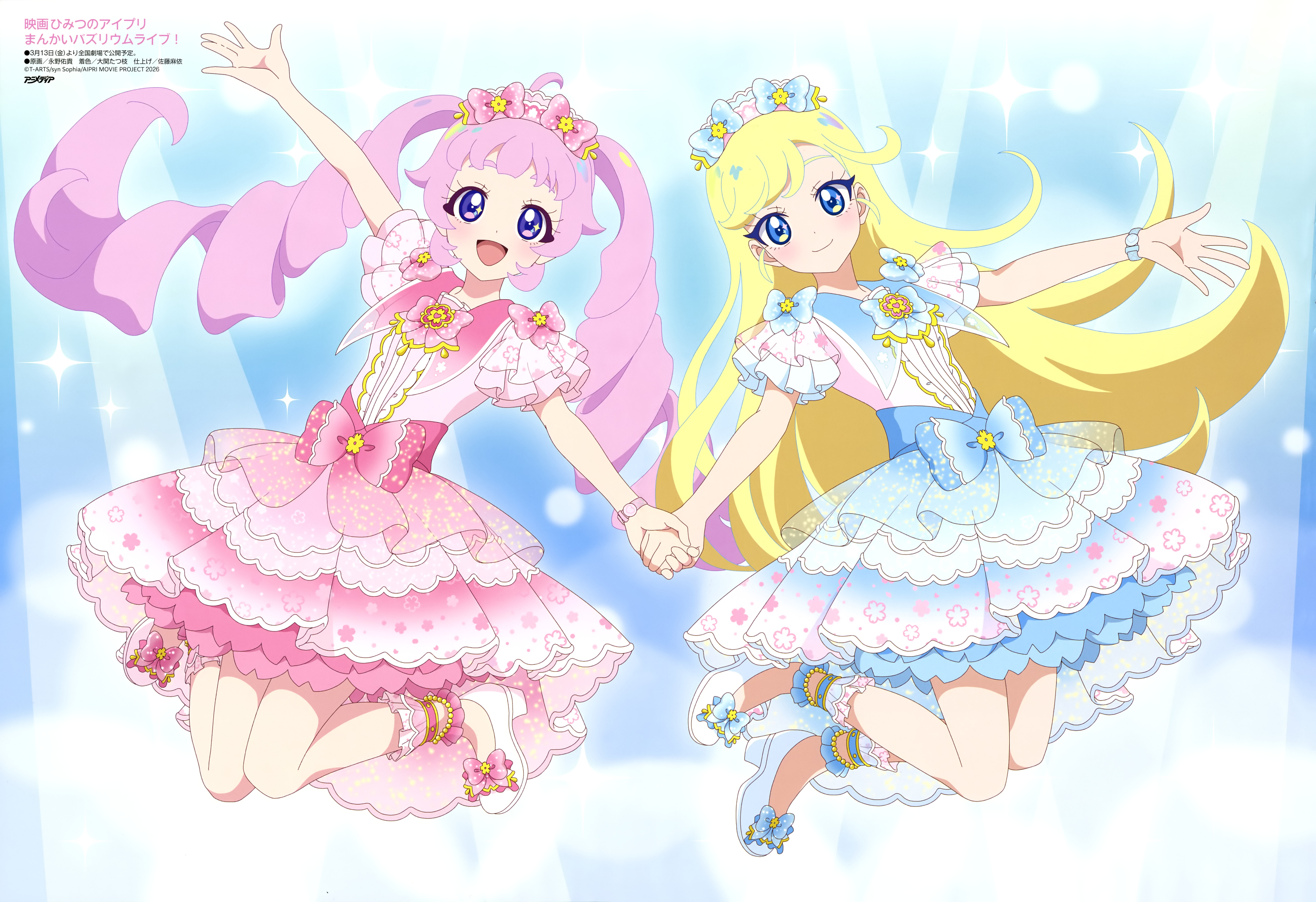2girls :d absurdres anime_coloring animedia aozora_himari artist_request blonde_hair blue_dress blue_eyes closed_mouth copyright_name copyright_notice dress drill_hair full_body high_heels highres himitsu_no_aipri holding_hands hoshikawa_mitsuki light_blush long_hair looking_at_viewer magazine_scan matching_outfits midair multiple_girls official_art open_mouth outstretched_arms parted_bangs pink_dress pink_hair pretty_series purple_eyes scan short_bangs short_dress short_sleeves smile star_(symbol) star_in_eye swept_bangs symbol_in_eye third-party_source twin_drills twintails