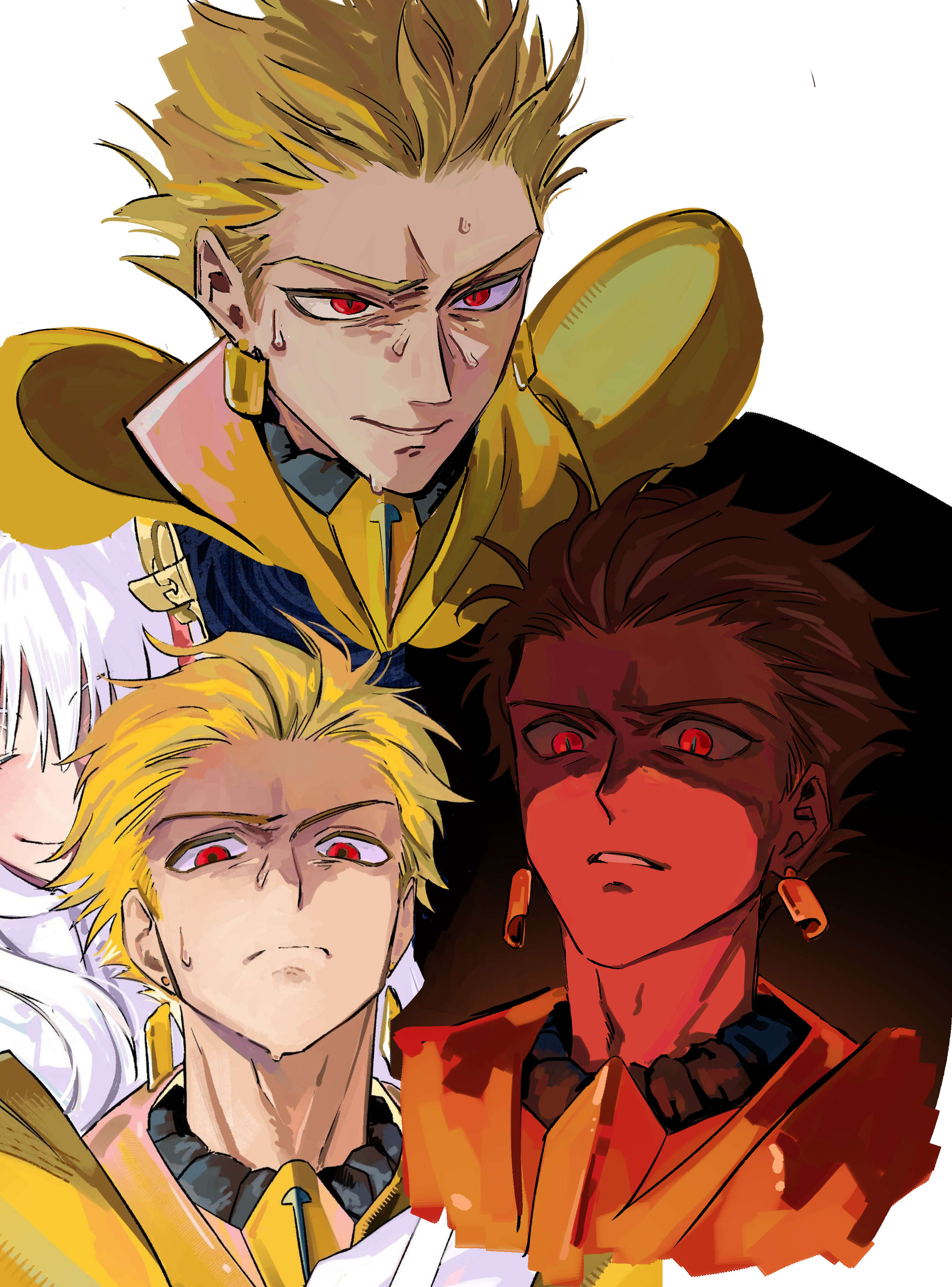 1boy 1girl absurdres armor biyoteu0201 blonde_hair closed_eyes commentary_request earrings fate/strange_fake fate_(series) fillia_(fate) gilgamesh_(fate) highres jewelry korean_commentary long_hair multiple_views red_eyes short_hair smile sweat white_hair