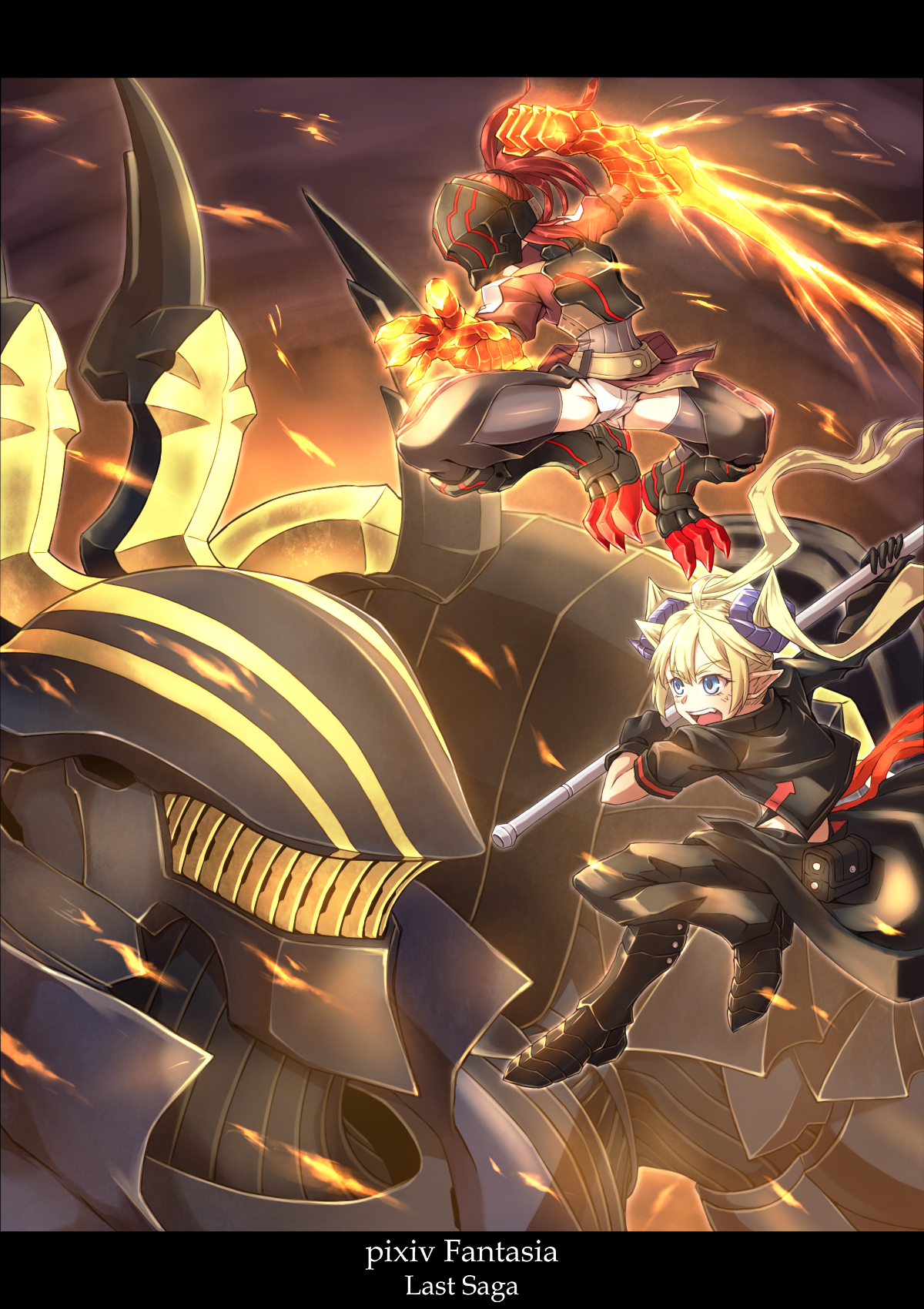 1boy 2girls armor belt_pouch black_boots black_gloves black_jacket blonde_hair blue_eyes boots chaley_patley clawed_boots commentary_request copyright_name fighting_stance gauntlets gloves glowing glowing_sword glowing_weapon highres holding holding_weapon horns jacket kaevin mecha multiple_girls pixiv_fantasia pixiv_fantasia_last_saga pouch raodekiya robot shuno_glen twintails weapon