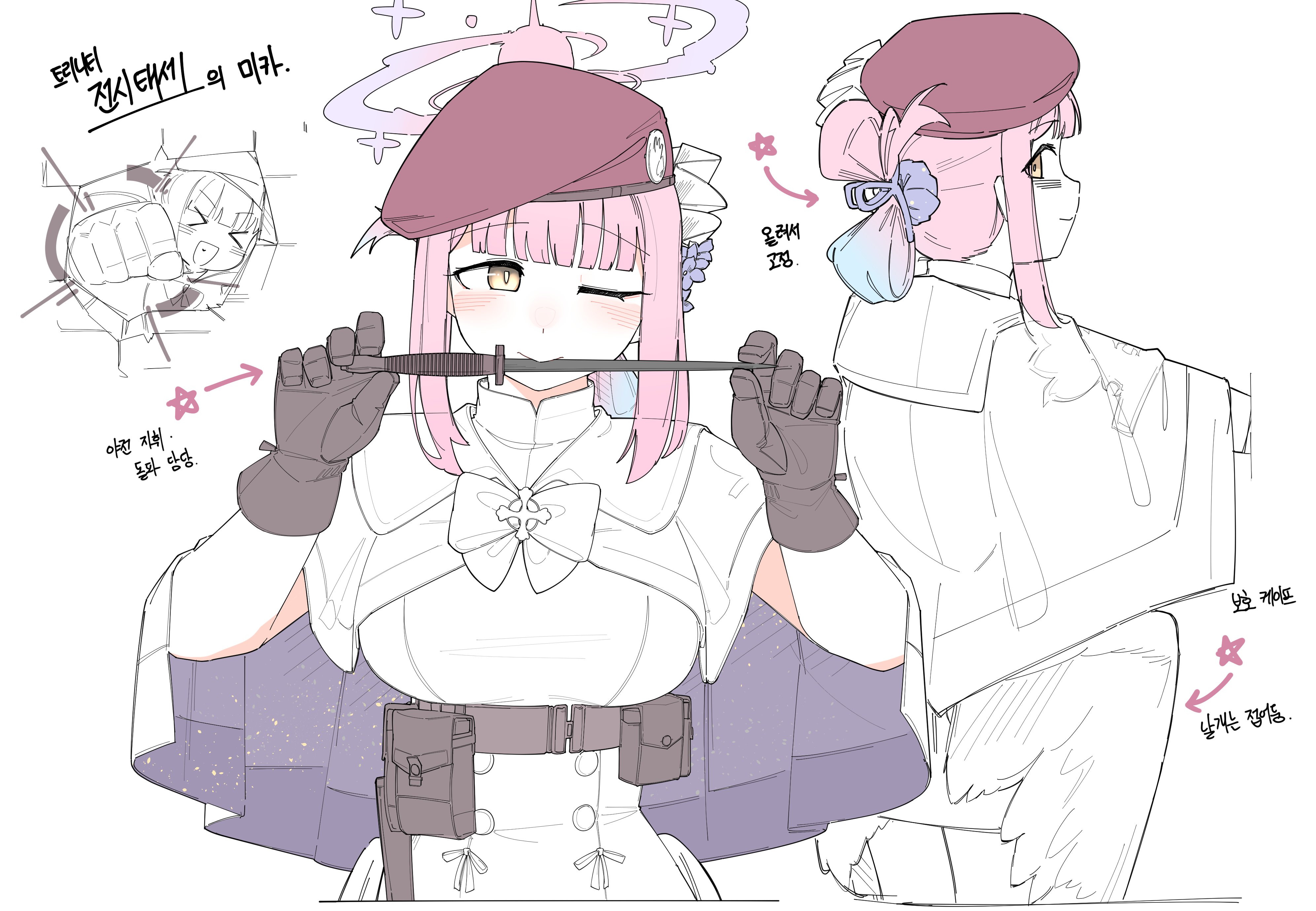 1girl absurdres ammunition_pouch beret blue_archive breasts brown_gloves commentary_request flukhan gloves halo hat highres holding holding_knife knife knife_in_mouth korean_commentary large_breasts medium_hair mika_(blue_archive) one_eye_closed pink_hair pouch wings yellow_eyes