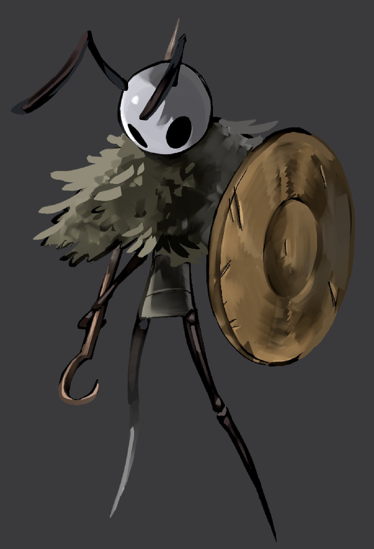 1boy antennae arthropod_boy black_eyes full_body grey_background highres holding holding_shield holding_weapon hollow_eyes hollow_knight hollow_knight:_silksong male_focus p_0p pin_(hollow_knight) seth_(hollow_knight) shield simple_background solo standing weapon