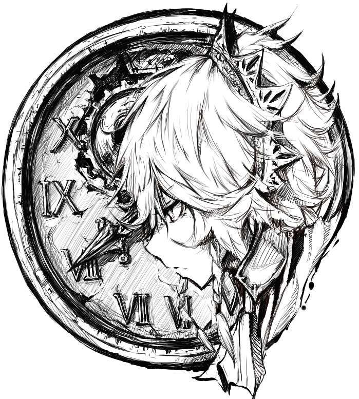 1girl analog_clock clock closed_mouth commentary_request cropped_head from_side greyscale izayoi_sakuya koumajou_densetsu looking_ahead maid_headdress monochrome narrow_(guohaoran) roman_numeral short_hair simple_background solo touhou white_background white_hair white_headdress