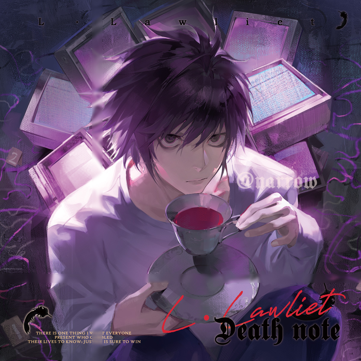1boy arm_up artist_name black_hair black_pants blue_pants character_name commentary_request cup death_note denim english_text hand_up highres holding holding_cup holding_saucer jeans knees_up l_(death_note) long_sleeves looking_at_viewer male_focus narrow_(guohaoran) pants saucer shirt short_hair sideburns solo television upper_body watermark white_shirt