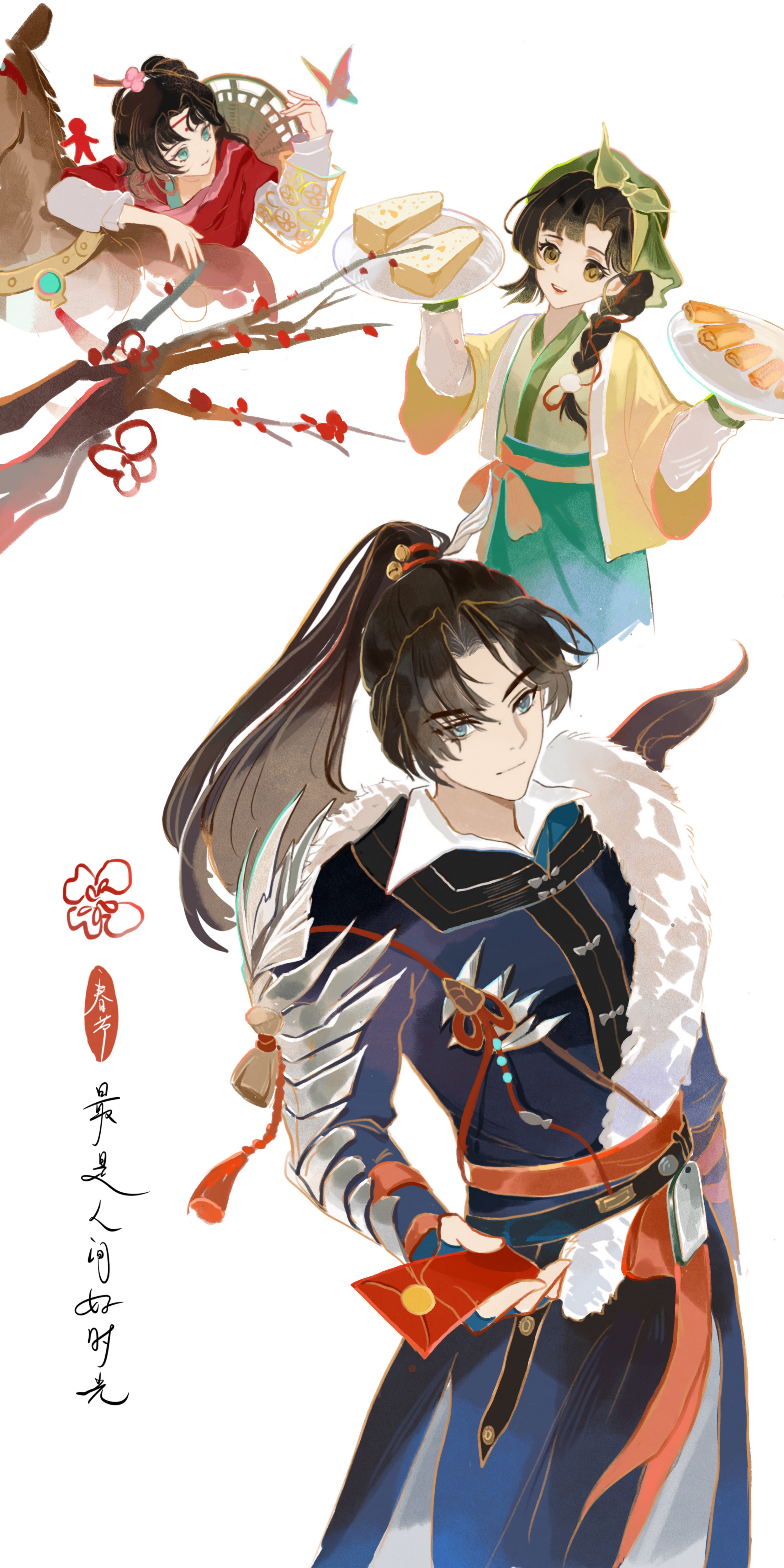 1boy 2girls :d absurdres arm_armor black_hair blue_eyes blue_robe braid branch bug butterfly cheng_heguang chinese_clothes chinese_new_year chinese_text closed_mouth cropped_torso facial_mark flower food forehead_mark fufuy. gift green_hanfu green_headscarf hanfu hat_on_back headscarf highres holding hongbao insect jacket long_braid long_hair looking_at_viewer looking_to_the_side mayfly_(reverse:1999) mule multiple_girls open_mouth osmanthus_cake paper_heron plate ponytail red_flower red_hanfu reverse:1999 robe single_arm_armor single_braid smile weimao white_background yellow_eyes yellow_jacket