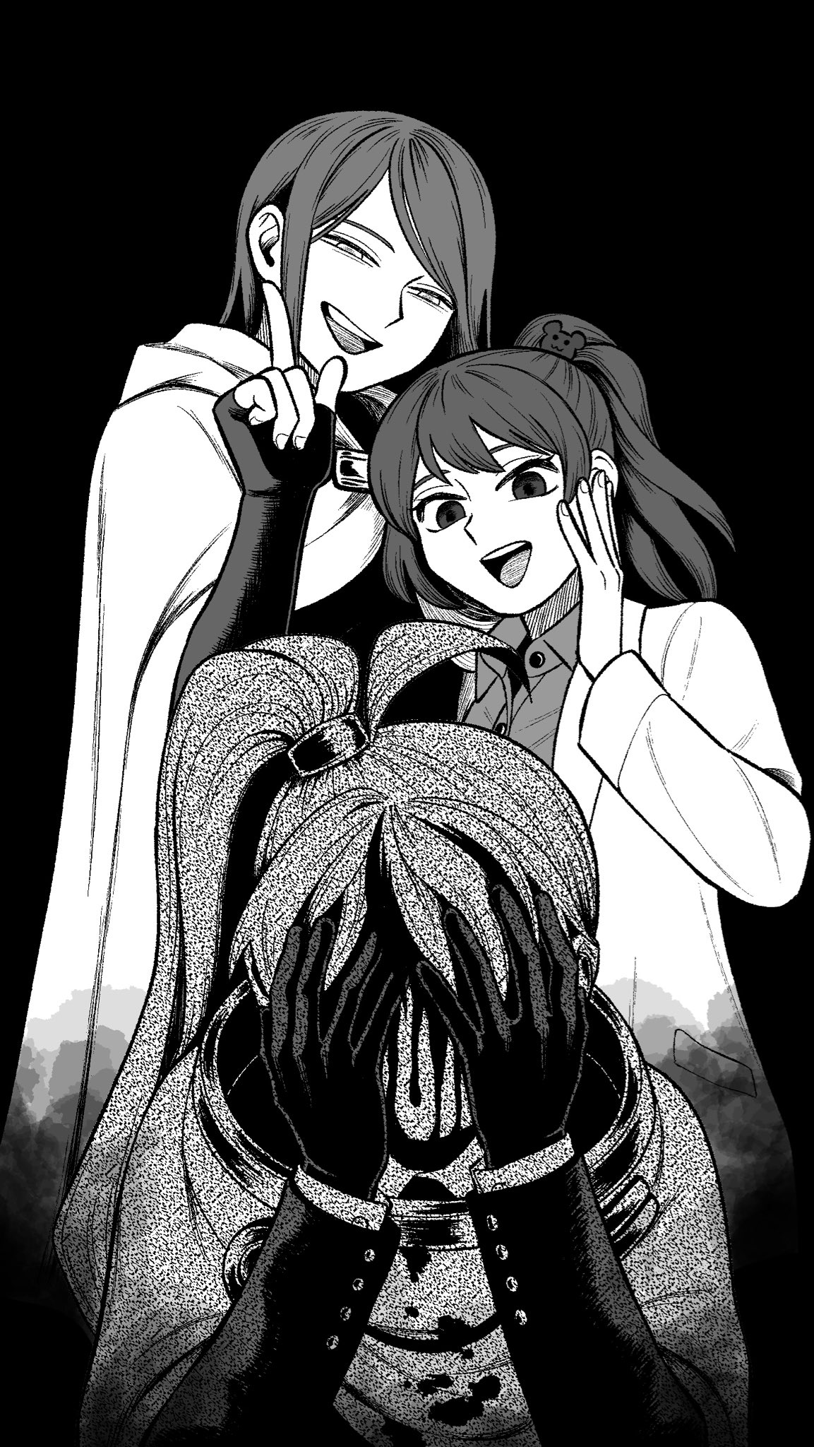 1boy 2girls ahoge androgynous black_background cape carmen_(project_moon) collared_shirt despair f_duck478 formal_clothes gloves greyscale half-closed_eyes highres index_finger_raised library_of_ruina moirai_(project_moon) monochrome multiple_girls ponytail project_moon shirt side_ponytail simple_background smile suit yan_vismok