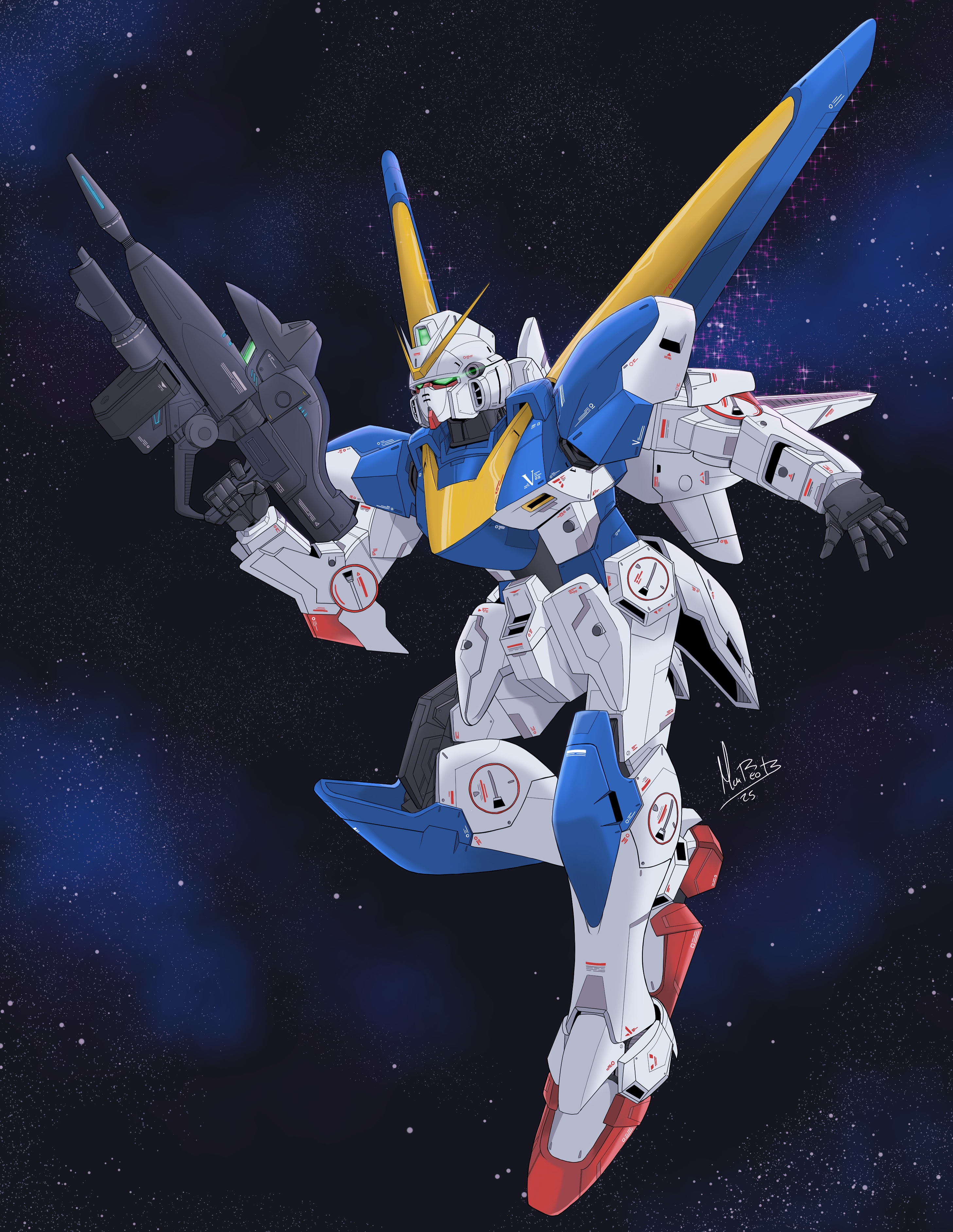 2025 absurdres artist_name commentary english_commentary flying green_eyes gun gundam highres holding holding_gun holding_weapon mattikron mecha mecha_focus mobile_suit no_humans open_hand robot science_fiction solo space star_(symbol) v-fin v2_gundam victory_gundam weapon
