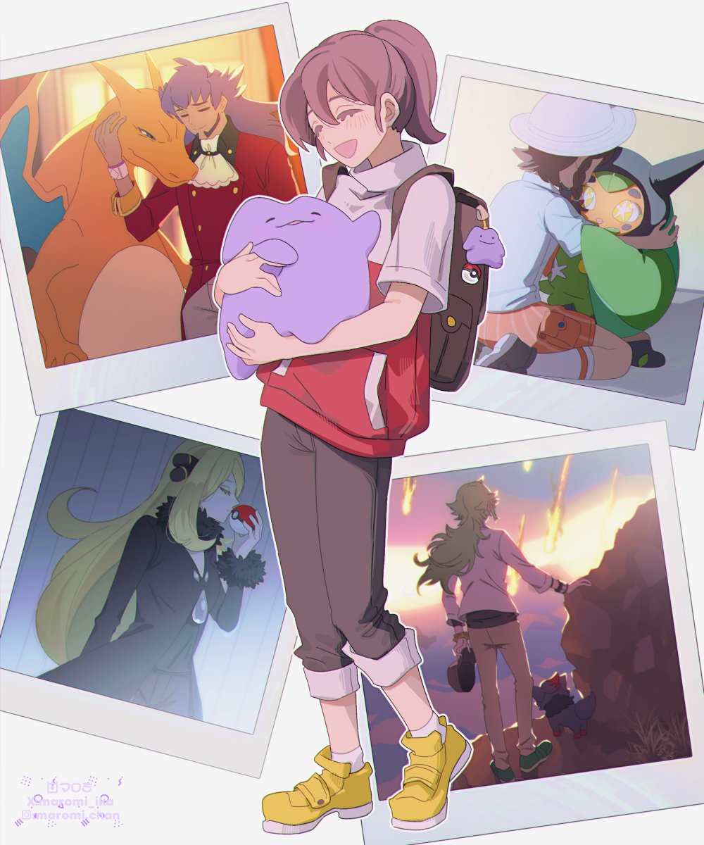 2girls 3girls backpack bag bag_charm baseball_cap black_coat black_pants blonde_hair braid breasts brown_hair cape character_charm charizard charm_(object) closed_eyes coat collared_shirt commentary_request cynthia_(pokemon) dark-skinned_male dark_skin ditto facial_hair female_protagonist_(pokemon_pokopia) fur_collar fur_trim gen_1_pokemon gen_5_pokemon green_hair hair_over_one_eye hat highres holding holding_poke_ball holding_pokemon holding_unworn_clothes holding_unworn_hat hug jacket juliana_(pokemon) leon_(pokemon) long_hair long_sleeves maromichan meteor multiple_boys multiple_girls n_(pokemon) naranja_academy_school_uniform nintendo ogerpon open_mouth orange_shorts pants photo_(object) poke_ball poke_ball_(basic) pokemon pokemon_(creature) pokemon_black_and_white pokemon_diamond/pearl/platinum pokemon_pokopia pokemon_scarlet_and_violet pokemon_sword_and_shield ponytail purple_hair school_uniform shirt shoes short_sleeves shorts smile unworn_hat unworn_headwear very_long_hair white_shirt wings yellow_shoes zorua