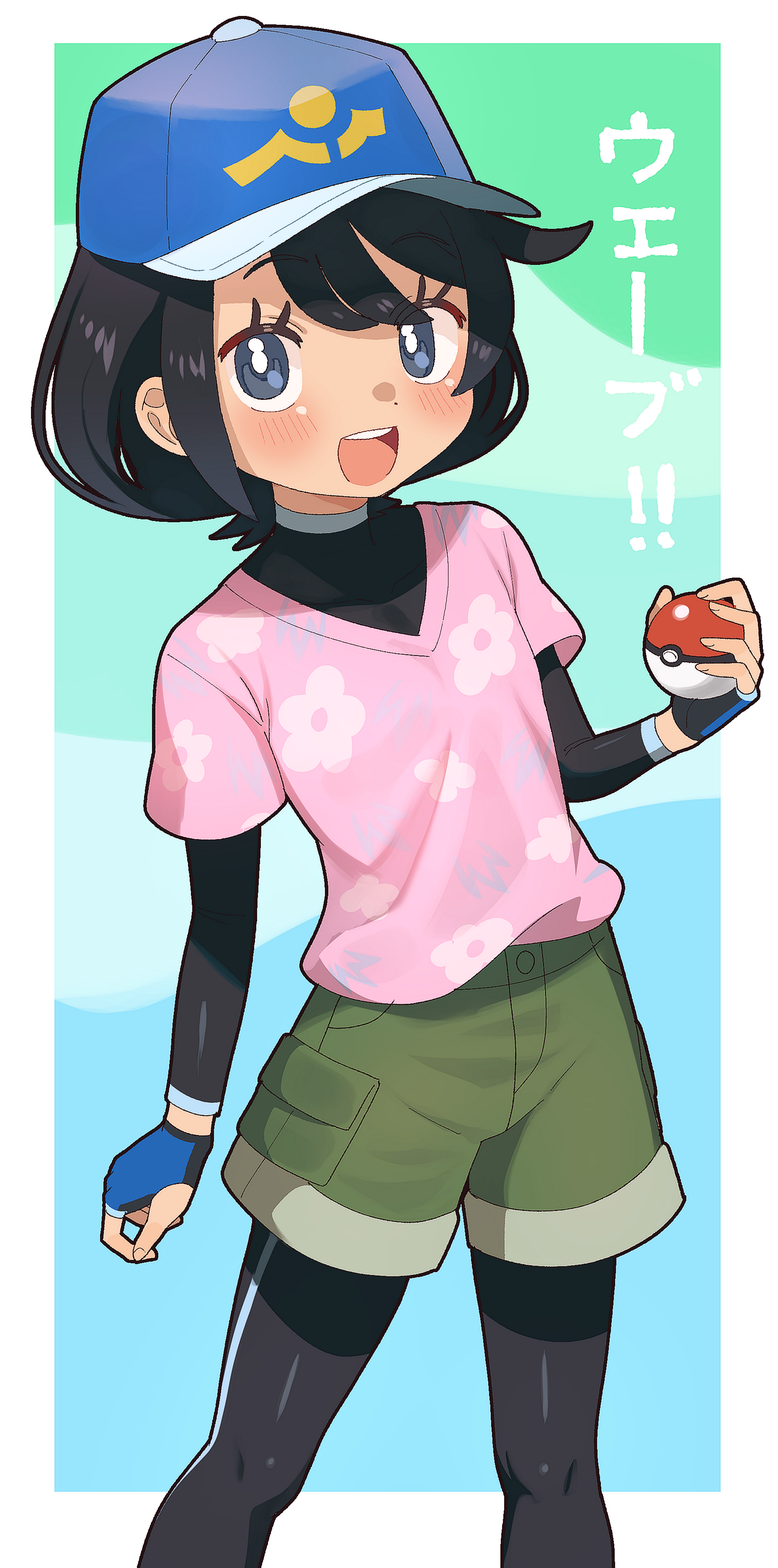 1girl :d absurdres baseball_cap black_hair black_pantyhose black_shirt blue_eyes blue_gloves blue_hat blush commentary_request feet_out_of_frame female_protagonist_(pokemon_ww) fingerless_gloves funifuchan gloves green_shorts hat highres holding holding_poke_ball layered_sleeves long_sleeves looking_at_viewer nintendo open_mouth pantyhose pantyhose_under_shorts pink_shirt poke_ball poke_ball_(basic) pokemon pokemon_winds_and_waves shirt short_hair short_over_long_sleeves short_shorts short_sleeves shorts smile solo standing teeth upper_teeth_only